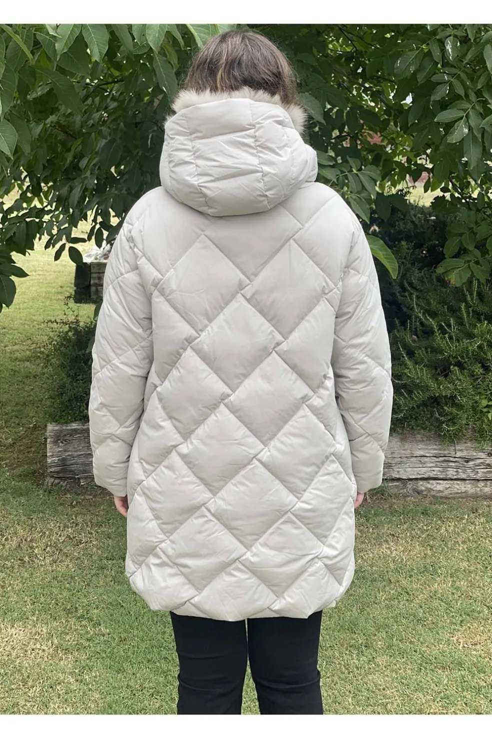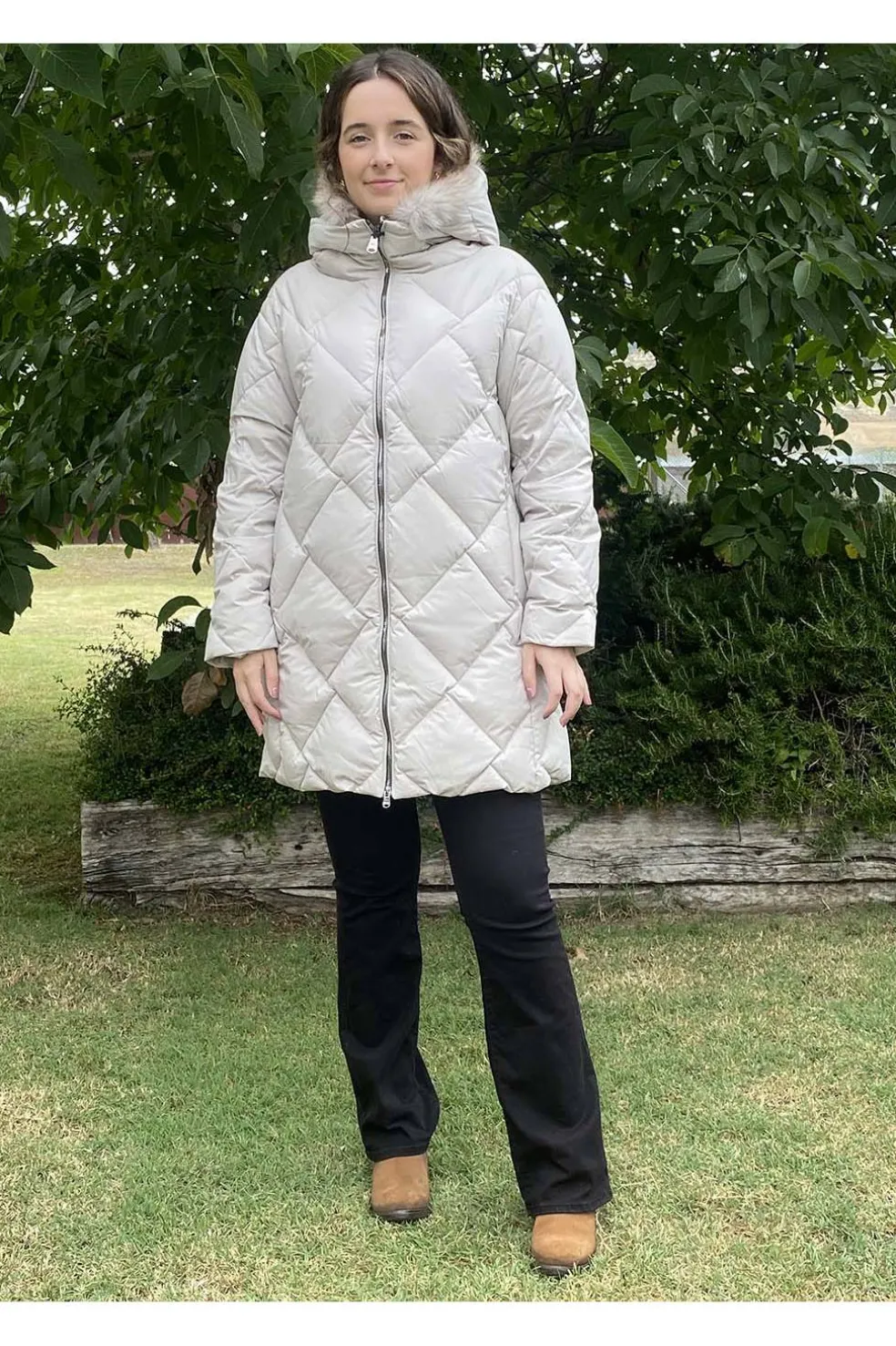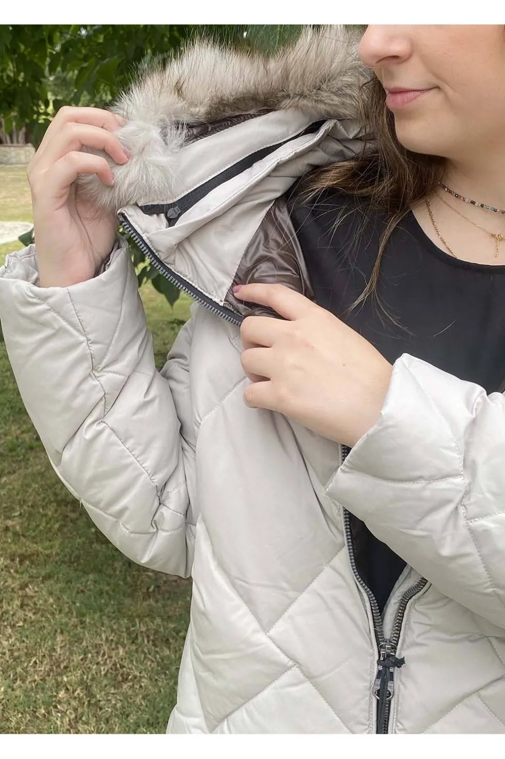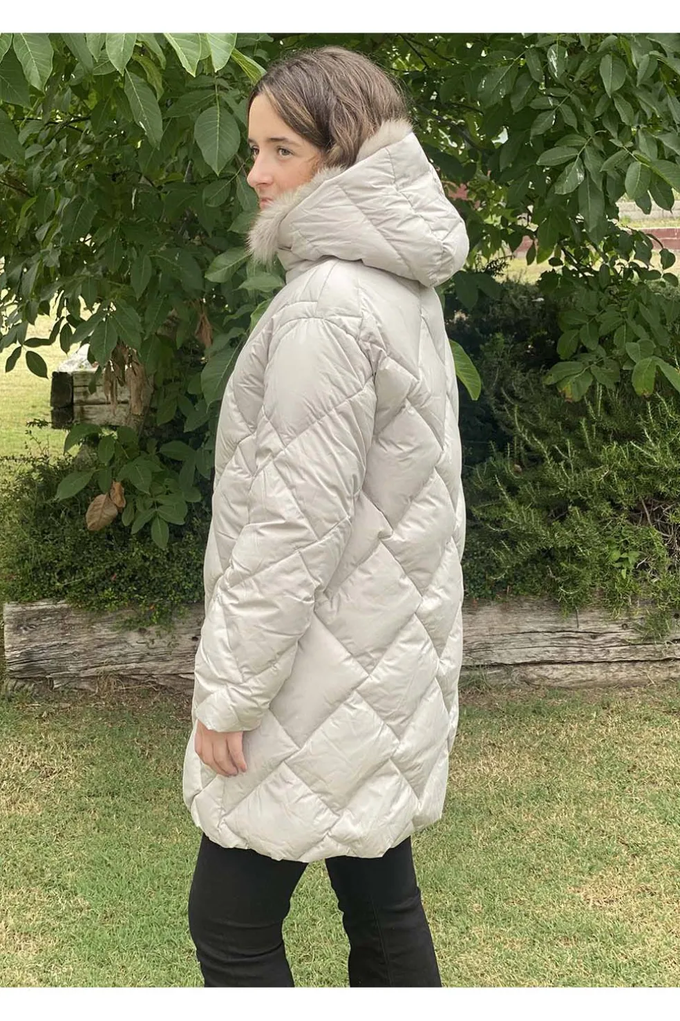 Este chaquetón es de pluma natural con una calidad sensacional , el cosido en diagonal lo hace diferente . Destaca su cuello importante y una tira de pelo natural que se desmonta .