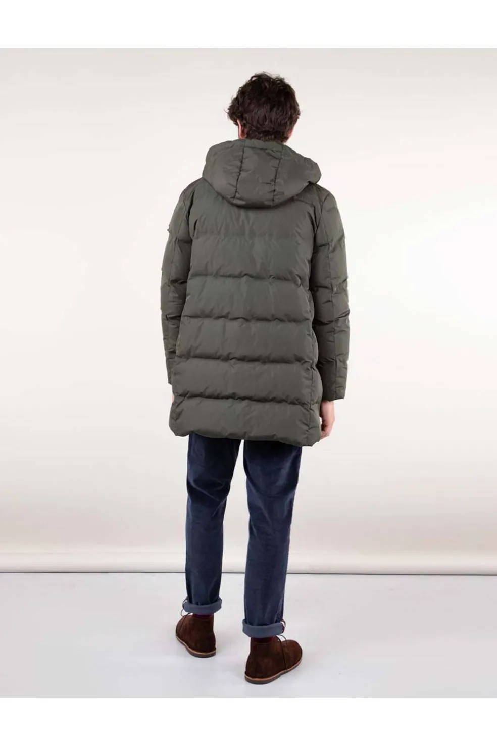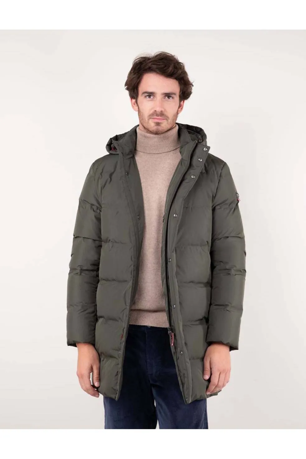 Abrigo largo acolchado de hombre. Relleno interior de pluma reciclada. Tejido de poliéster repelente al agua. Corte Regular Fit. Cuello con capucha desmontable con cremallera. Cierre con cremallera y tapeta con snaps. Detalle de cinta de bandera en la tapeta interior.