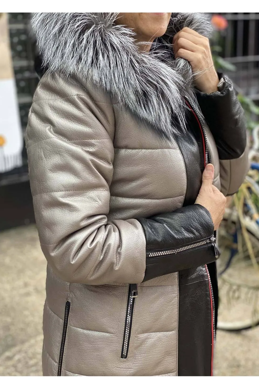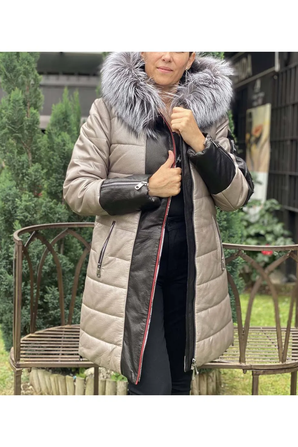 Abrigo de napa semi acolchada, con cremalleras XXL en el lateral y en los puños. Piel exquisita con un ligero toque metalizado y color negro. Capucha de pelo natural fox y un largo de 86 cm.