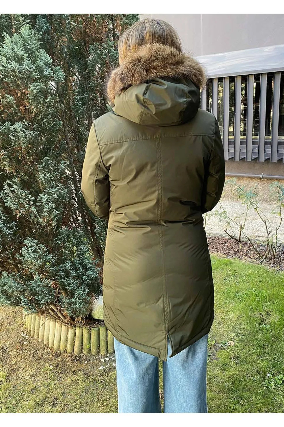 Abrigo de mujer con dos bolsillos laterales con solapa, pieza de pelo natural en la parte delantera de la cremallera y la capucha.