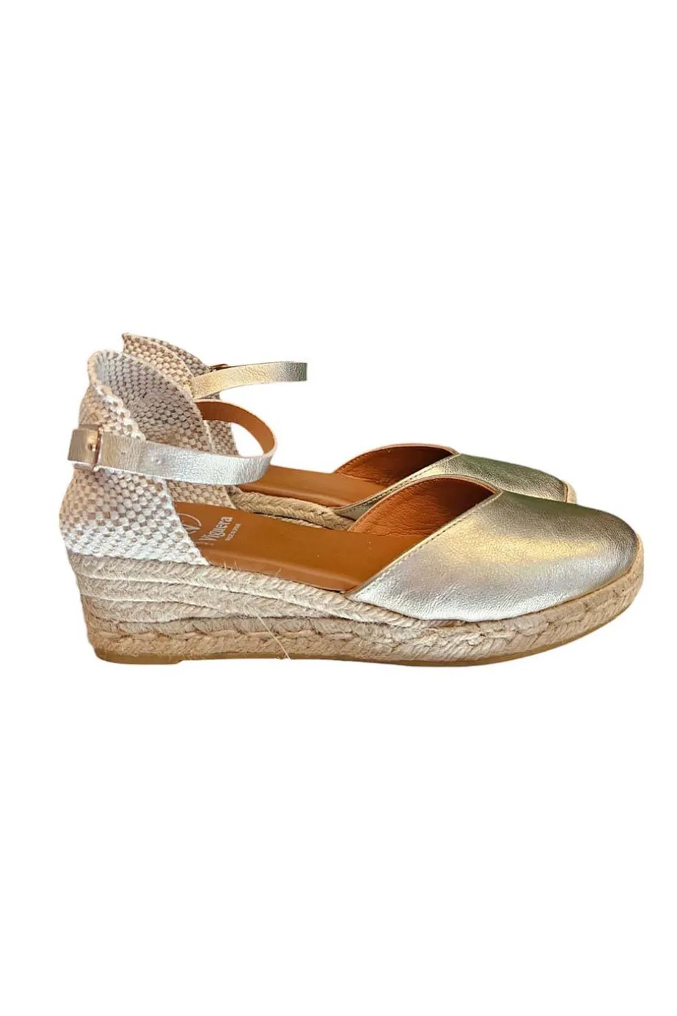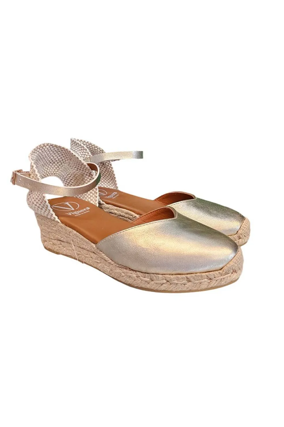 Alpargata de cuña baja de yute de 5 cm, fabricada en piel de alta calidad, con plantilla de piel acolchada, pulsera al tobillo y cierre mediante hebilla para una sujección óptima. Con puntera redondeada y escote en forma de «V» para ofrecer una imagen estilizada de nuestros pies. Comodidad, durabilidad y versatilidad de un calzado 100% español.