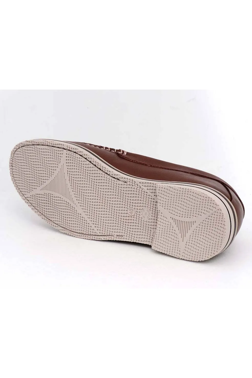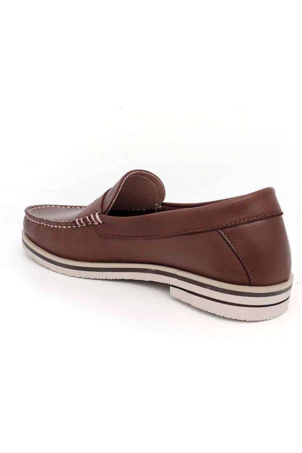 Mocasín de piel con antifaz con pespuntes en contraste. Suela bicolor.