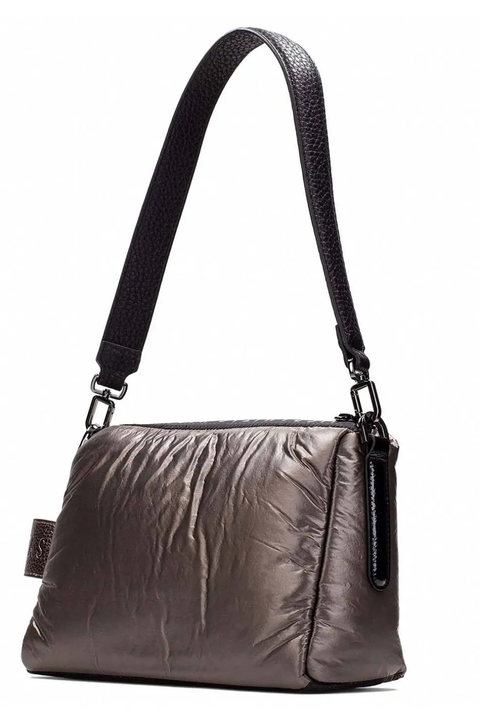 - Bolso de hombro confeccionado en nylon con cierre de cremallera.