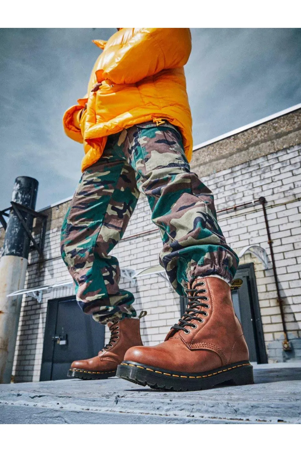 - Farrier es una piel napa de anilina cerosa con un sutil acabado que cambia ligeramente de color al doblarla o al aplicarle presión y mejora con el tiempo. Resistente y duradera, con el tiempo desarrollará un aspecto desgastado de aires vintage. Cuídala con el betún para zapatos de Dr. Martens.