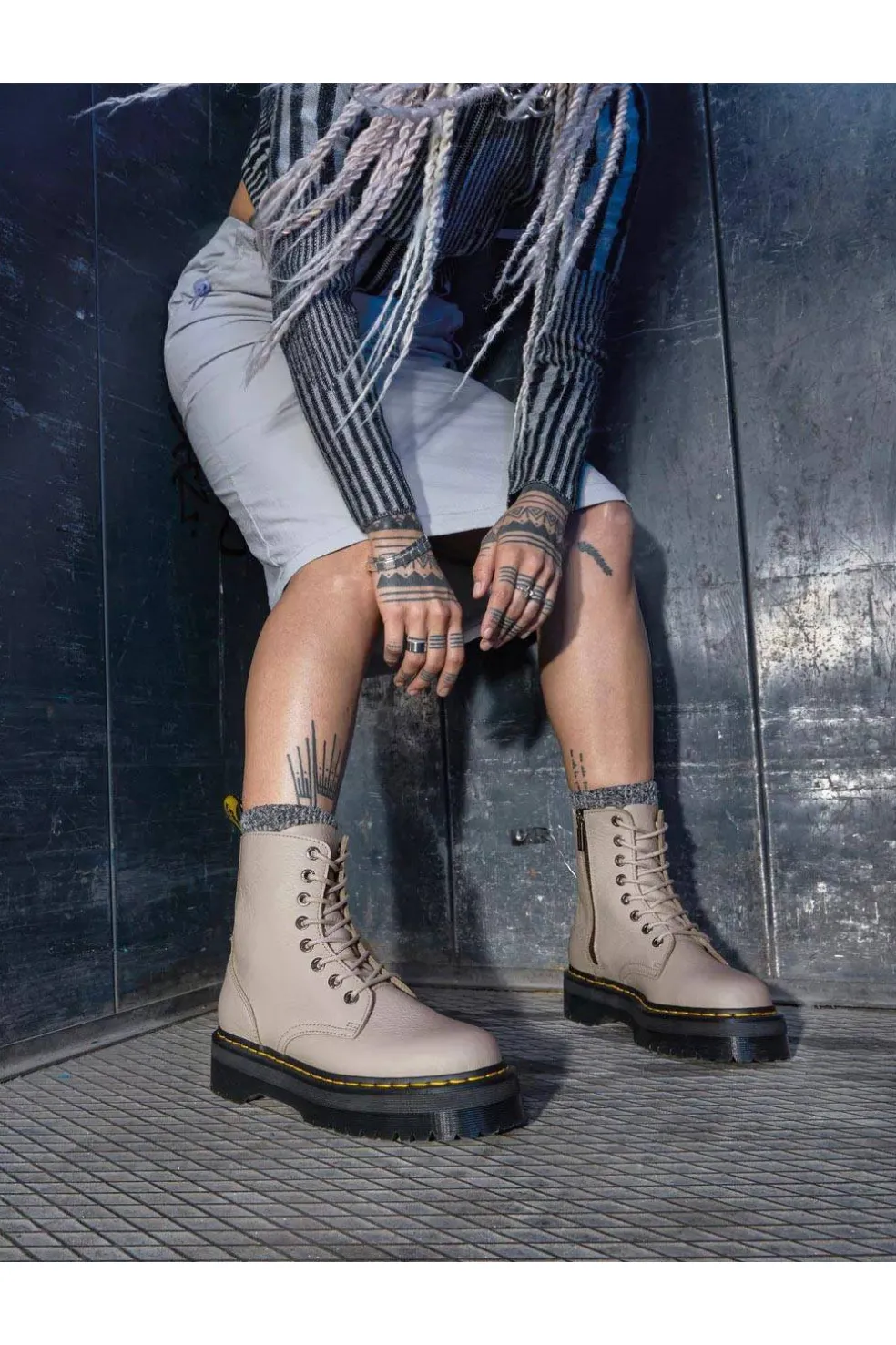 Una evolución a todo volumen de nuestra silueta Original: la bota Jadon vuelve esta temporada en una versión que capta la atención al instante. La bota Jadon II se ha confeccionado en una piel Pisa abatanada con una textura y un acabado encerado muy atractivos. Las botas con plataforma se asientan sobre nuestra suela de 4.7 cm con cámara de aire y están acabadas con nuestro inconfundible pespunte amarillo y un tirador con el logo en blanco y negro.