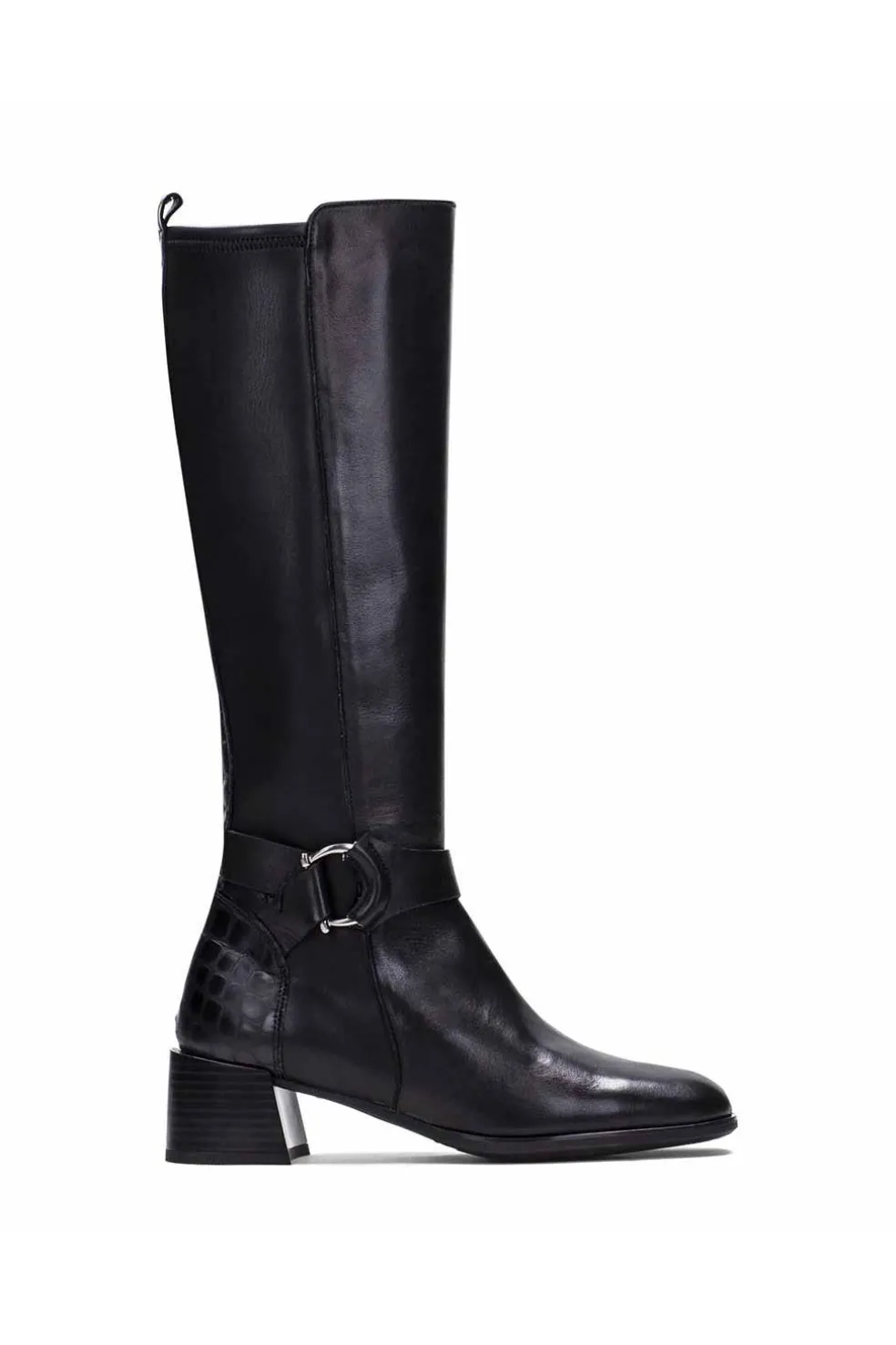 Bota alta elaborada en napa combinada con grabado en la parte trasera. Tacón bloque sobresaliente, cierre de cremallera y adorno metálico en el lateral. El básico por excelencia del invierno. Este zapato incorpora la tecnología TRIFLOW, amortigua cada paso aportando flexibilidad y confort en la pisada, gracias a su triple almohadillado.