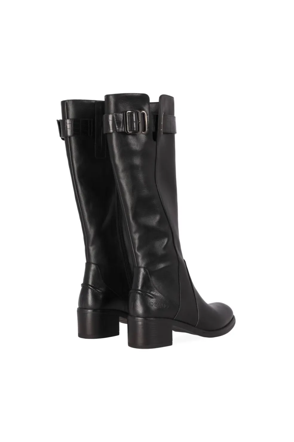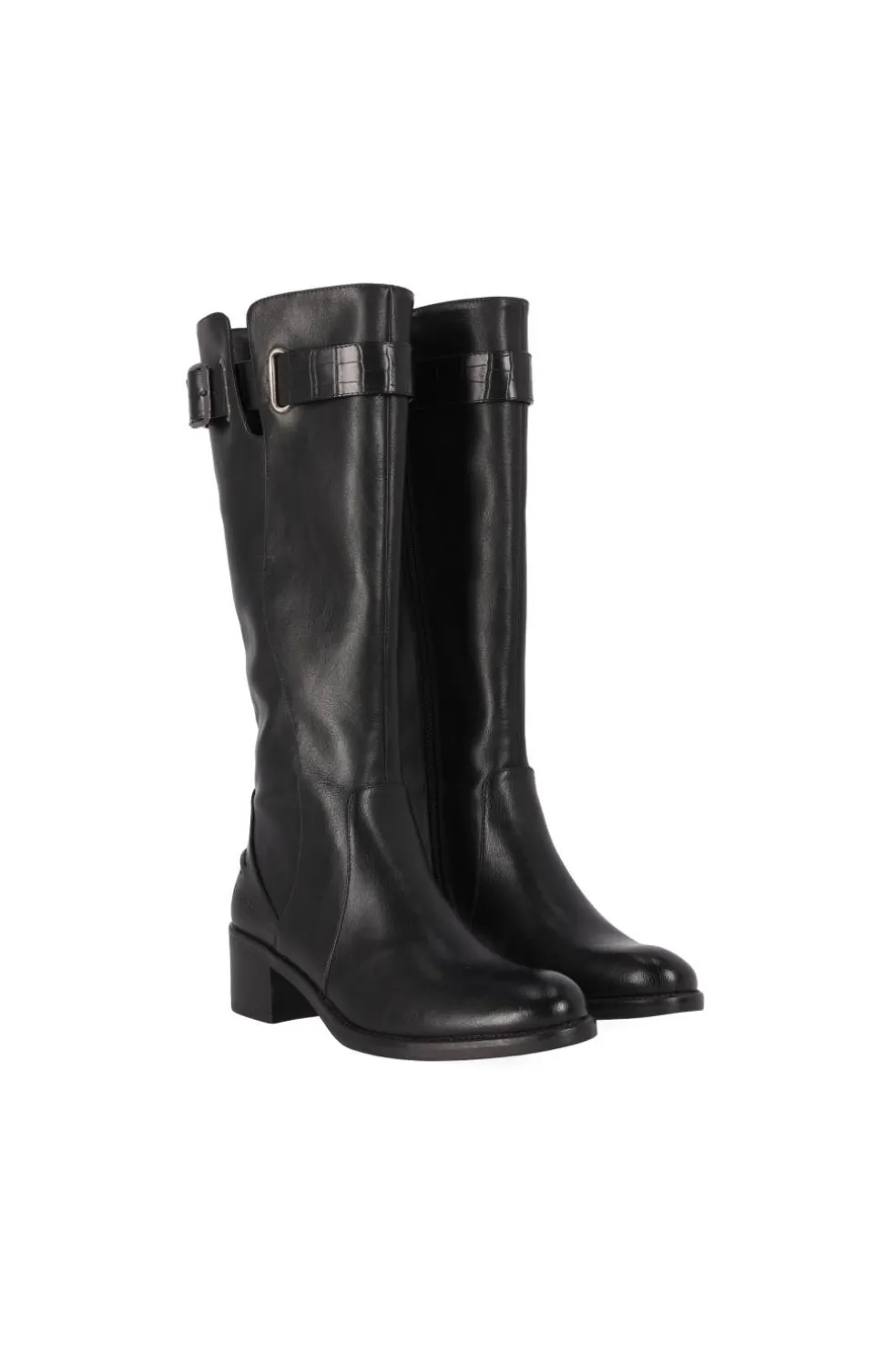 Bota en color negro . El perfecto clásico de corte alto con cremallera interior y hebilla decorativa en el cuello de la bota.