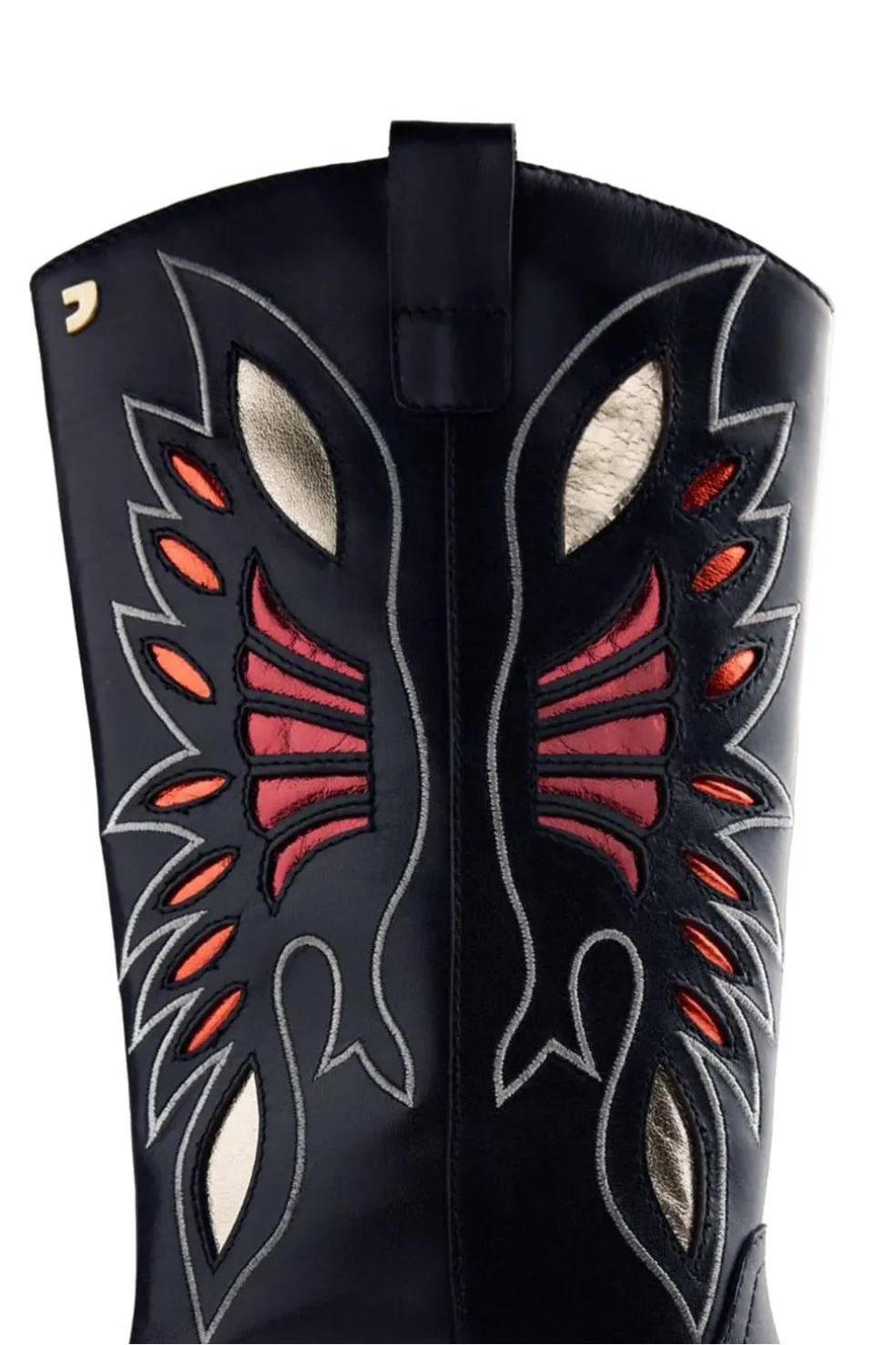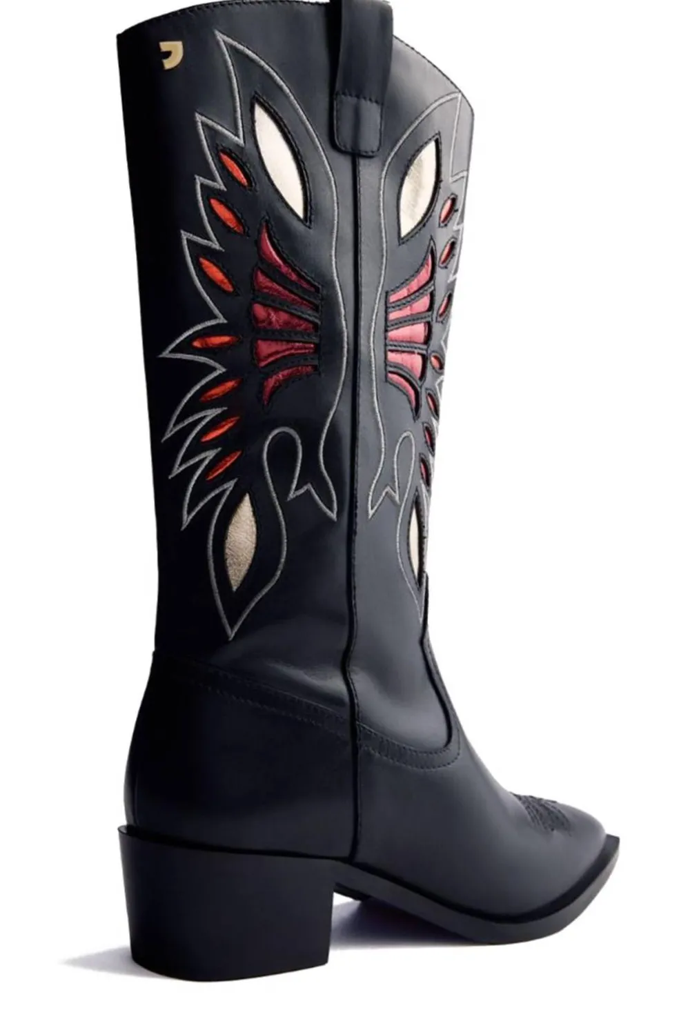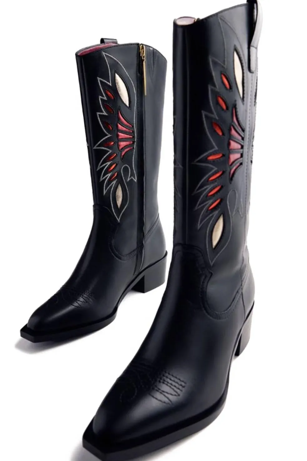 Botas de piel estilo cowboy con bordado y acentos metalizados. Caña alta, punta ovalada y tacón cubano. Cuentan con plantilla acolchada y cremallera en el lateral interno de la caña. Altura tacón: 4 cm. Altura caña: 28 cm. Seguimos la guía estándar de anchos de caña, ajustando la medida según la talla. El número 37 se adapta a gemelos con un perímetro de hasta 38 cm.