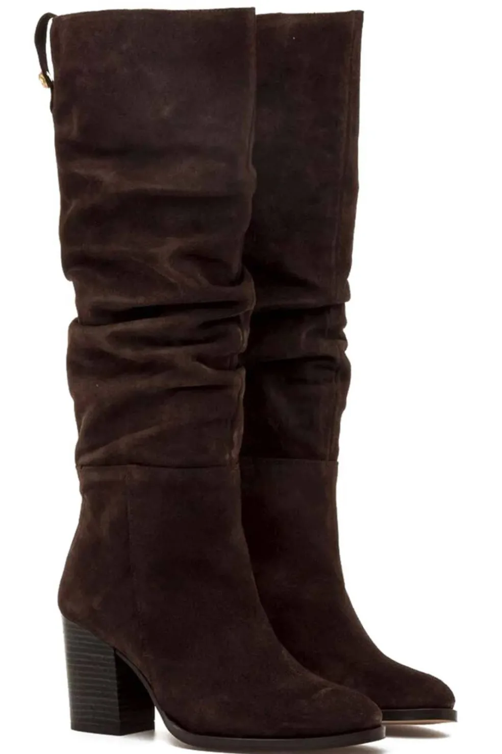 Botas altas de tacón para mujer de la marca Mustang, modelo Rose de color moka con acabado de serraje. Fabricado con piel que proviene de fabricantes aprobados por el protocolo «Leather Working Group», donde evalúan el cumplimiento ambiental y el desempeño, promoviendo prácticas comerciales ambientales sostenibles dentro de la industria del cuero. La caña amplia con efecto fruncido aporta un estilo desenfadado, mientras que el tacón ancho eleva la figura. El detalle trasero con tira y botón metálico le añade un toque decorativo sutil. Esta bota combina funcionalidad y estilo para looks urbanos durante los meses más fríos.
