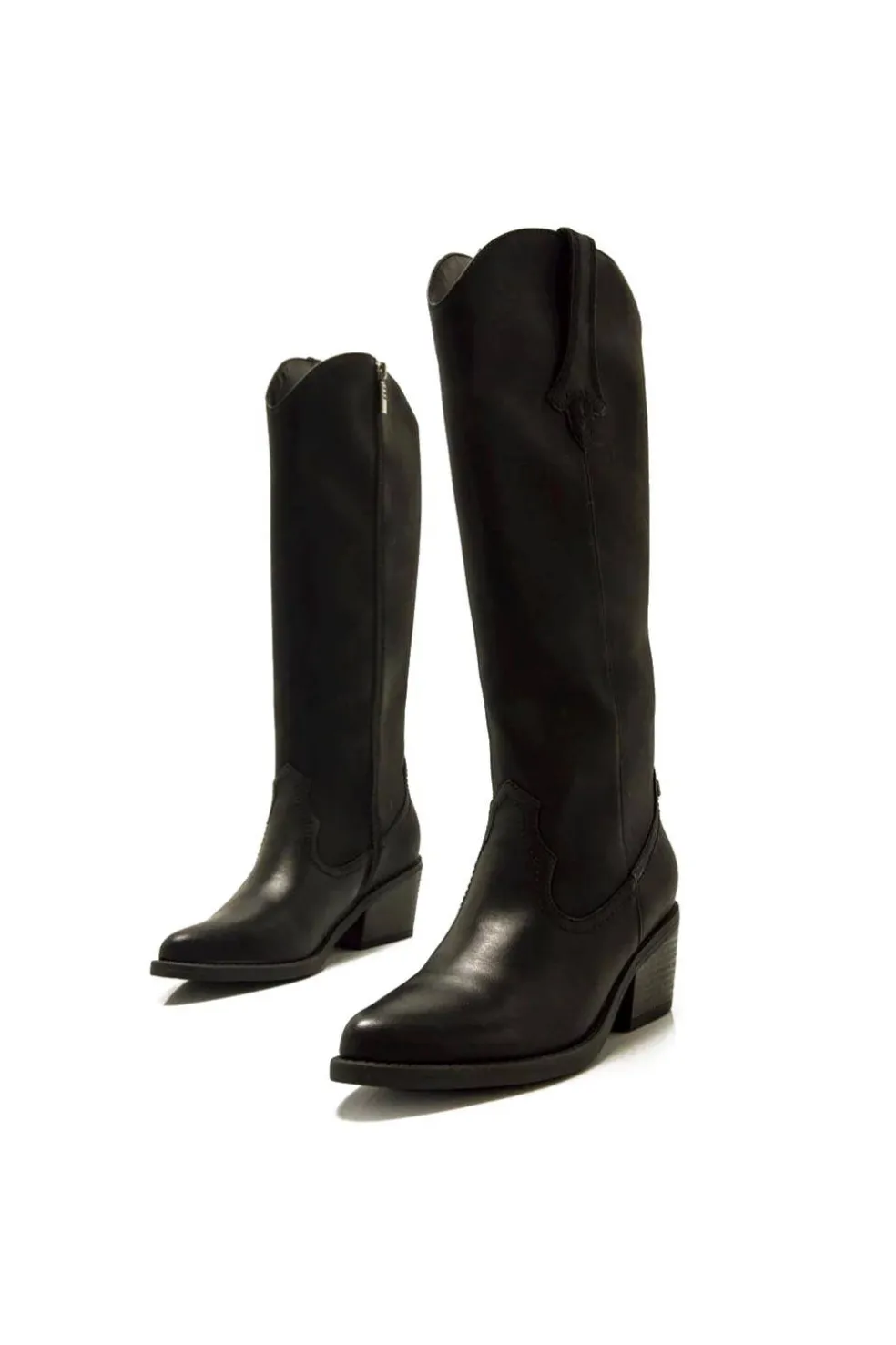 Bota alta Tanubis Mustang para mujer. Diseñada en color negro, destaca gracias a su cómodo tacón de altura media y horma en punta. Diseño western en la parte inferior de la caña. Incluye cierre de cremallera interior en el lateral de la bota. Le darán el toque extra de estilo a tus looks diarios.