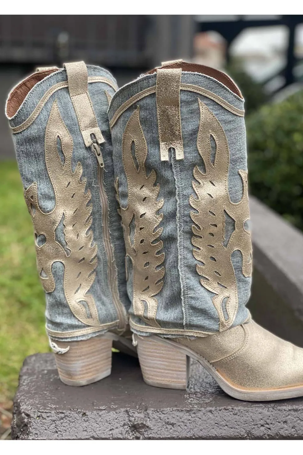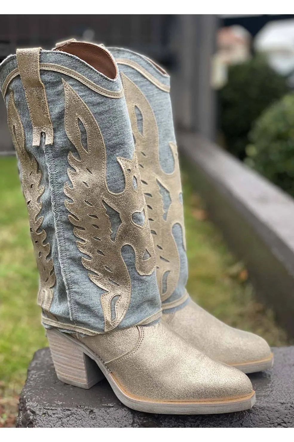 Disfruta de las últimas tendencias con las botas Nemonic 2381. Suela de goma con la puntera dorada con glitter. Detalles en la caña dorados sobre un fondo vaquero, dándole un toque auténtico. Bonita chapa metálica en el tacón