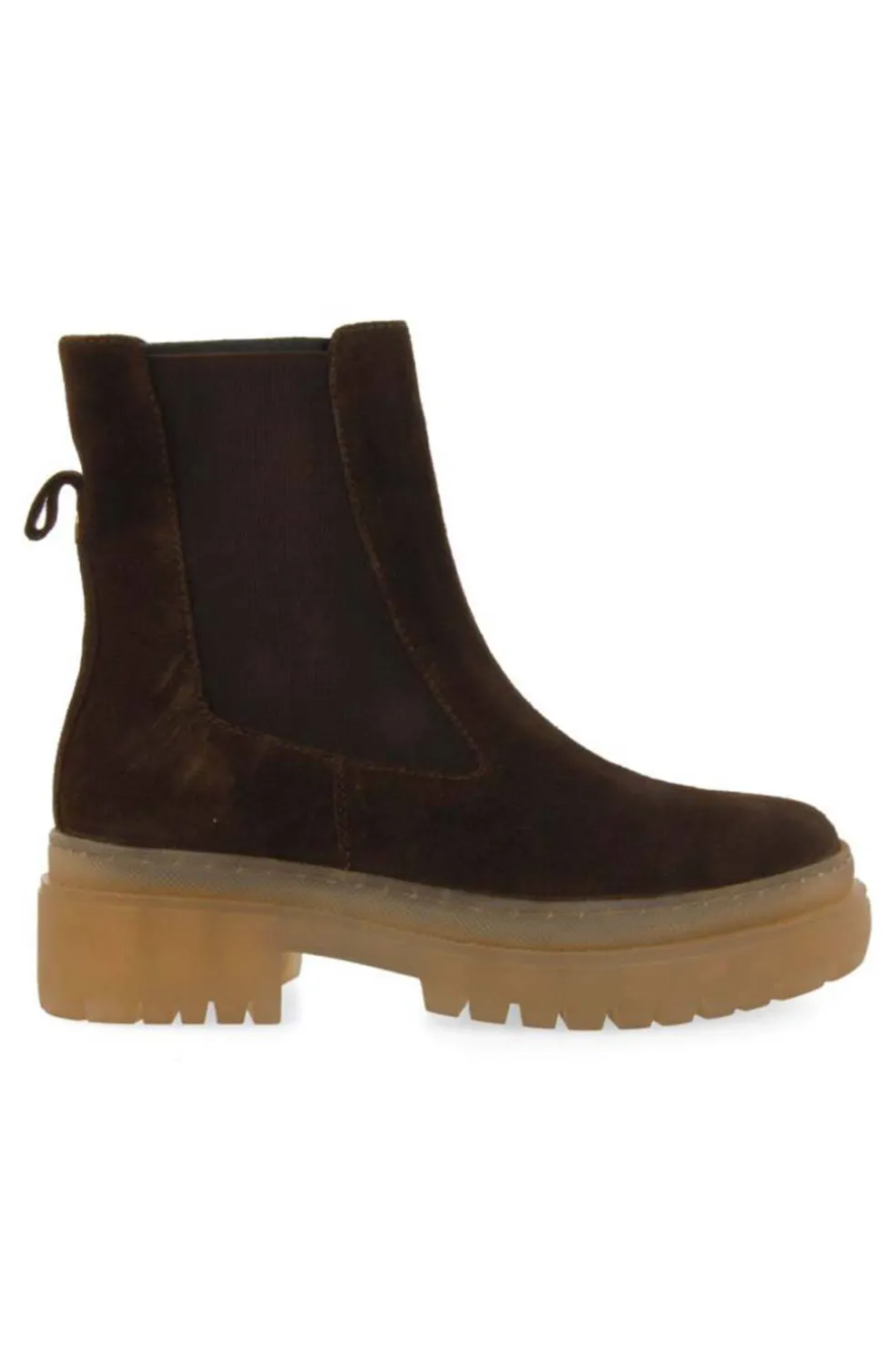 Botín marrón oscuro tipo chelsea con elásticos en serraje con piso track caramelo en contraste. Planta y vista de forro en piel LWG, muy acolchada con planta de látex. Forro en poliéster reciclado. Planta de fibras naturales y piso de caucho flexible.
