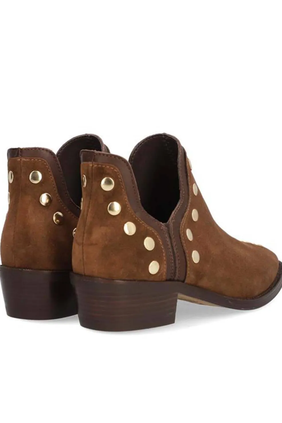 Botín de piel en tono marrón con diseño sin cremallera y un cómodo tacón cuadrado de 4 cm. Destaca por sus llamativas tachuelas circulares en el empeine y lateral, que aportan un toque atrevido y original a un estilo campero con mucha personalidad.