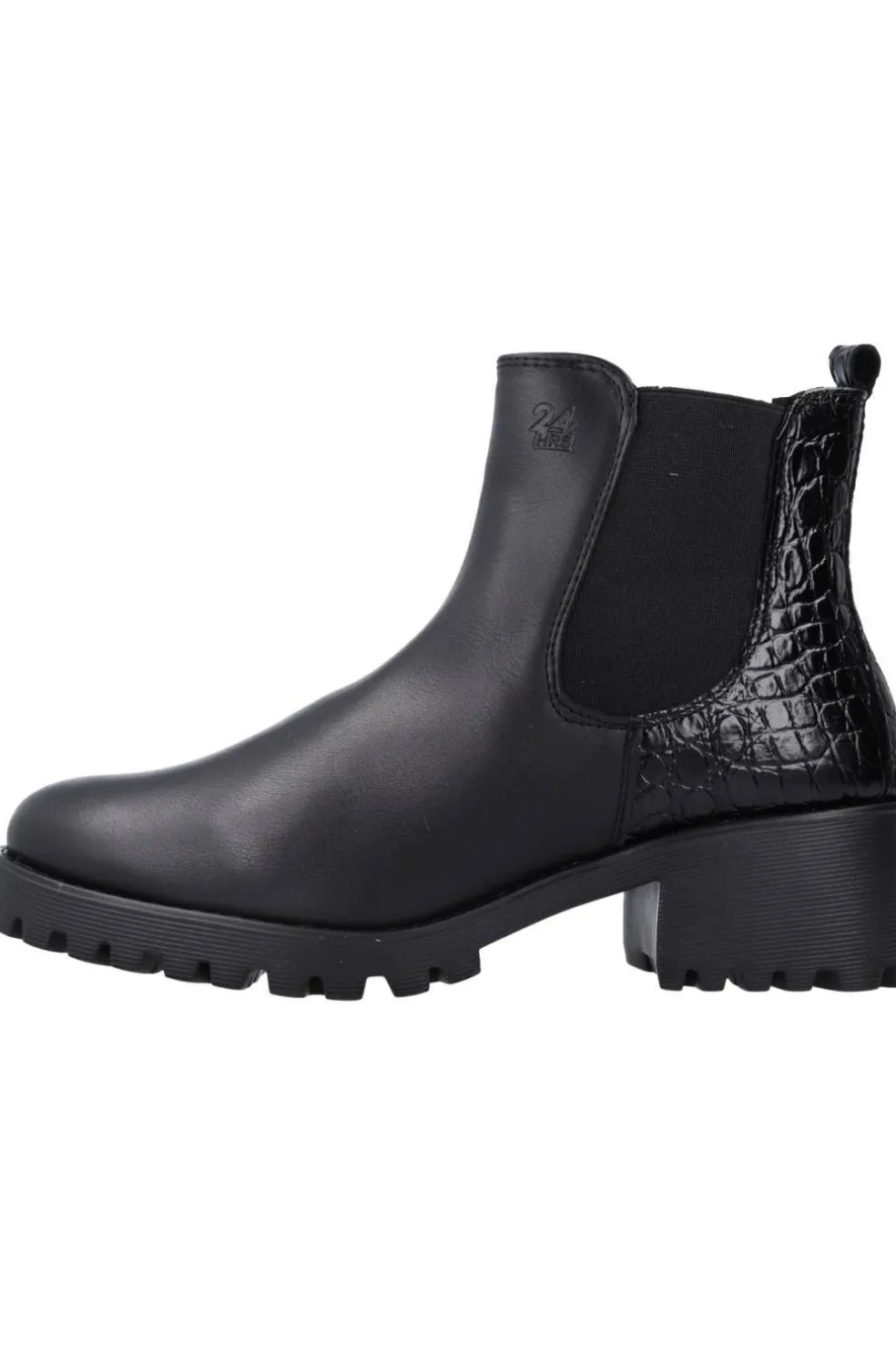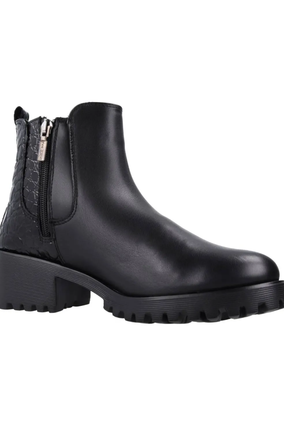 Botín mujer en piel color negro. Cierre de cremallera y elástico lateral para facilitar el calzado, puntera redonda y marca grabada en empeine. Suela dentada en EVA ultraligera con 5,5 cm de altura y tecnología exclusiva.