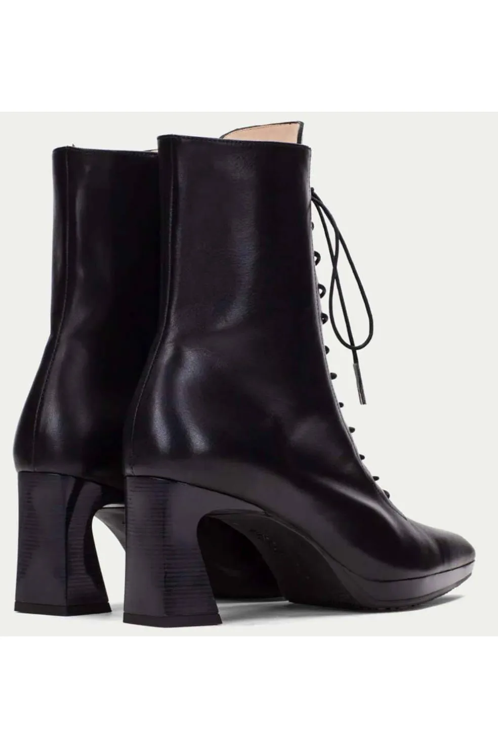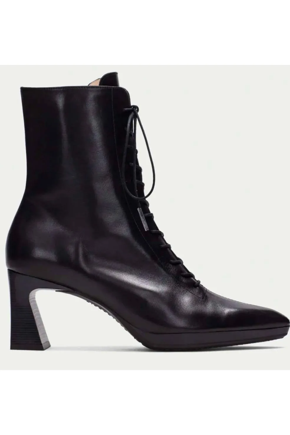 Botín acordonado con puntera afilada y cremallera lateral que facilita el calce.