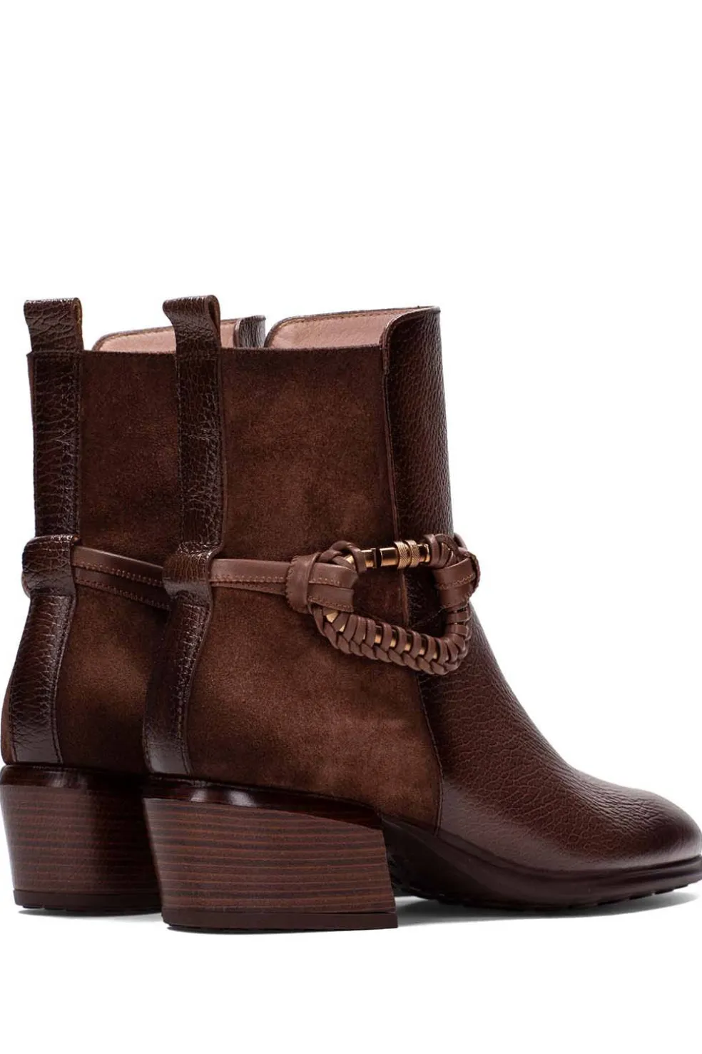 Botín con detalle de tiras y mosquetón forrado en piel sintética y cremallera lateral que facilita el calce. Cuenta con piso efecto goma con perfil de tacos y tacón cubano de 5 cm con acabado madera. Elaborado en piel, con forro interior de origen no animal, 100% transpirable y termorregulador, e incorpora tecnología Triflow para una pisada acolchada y cómoda. Altura del tacón: 4 cm.