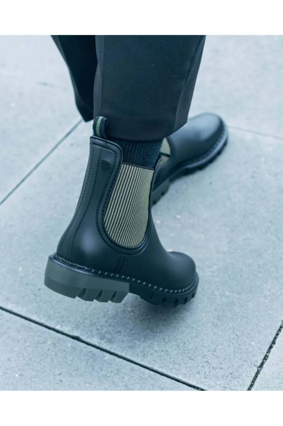 Botín de agua bicolor estilo track, con acabado mate, textil en los laterales, plantilla confort extraíble y forro textil. Fabricada en España.