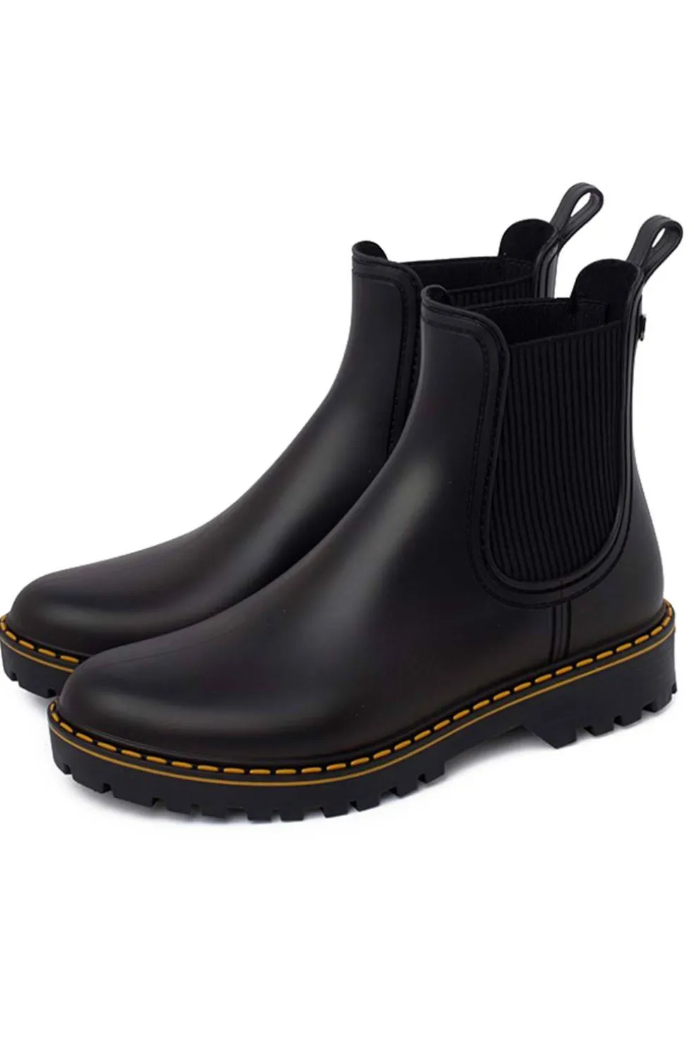 Botín de agua en color negro y costura amarilla con diseño estilo track, acabado mate y laterales de textil. Cuenta con una plantilla de confort extraíble y un forro textil. Fabricado en España.