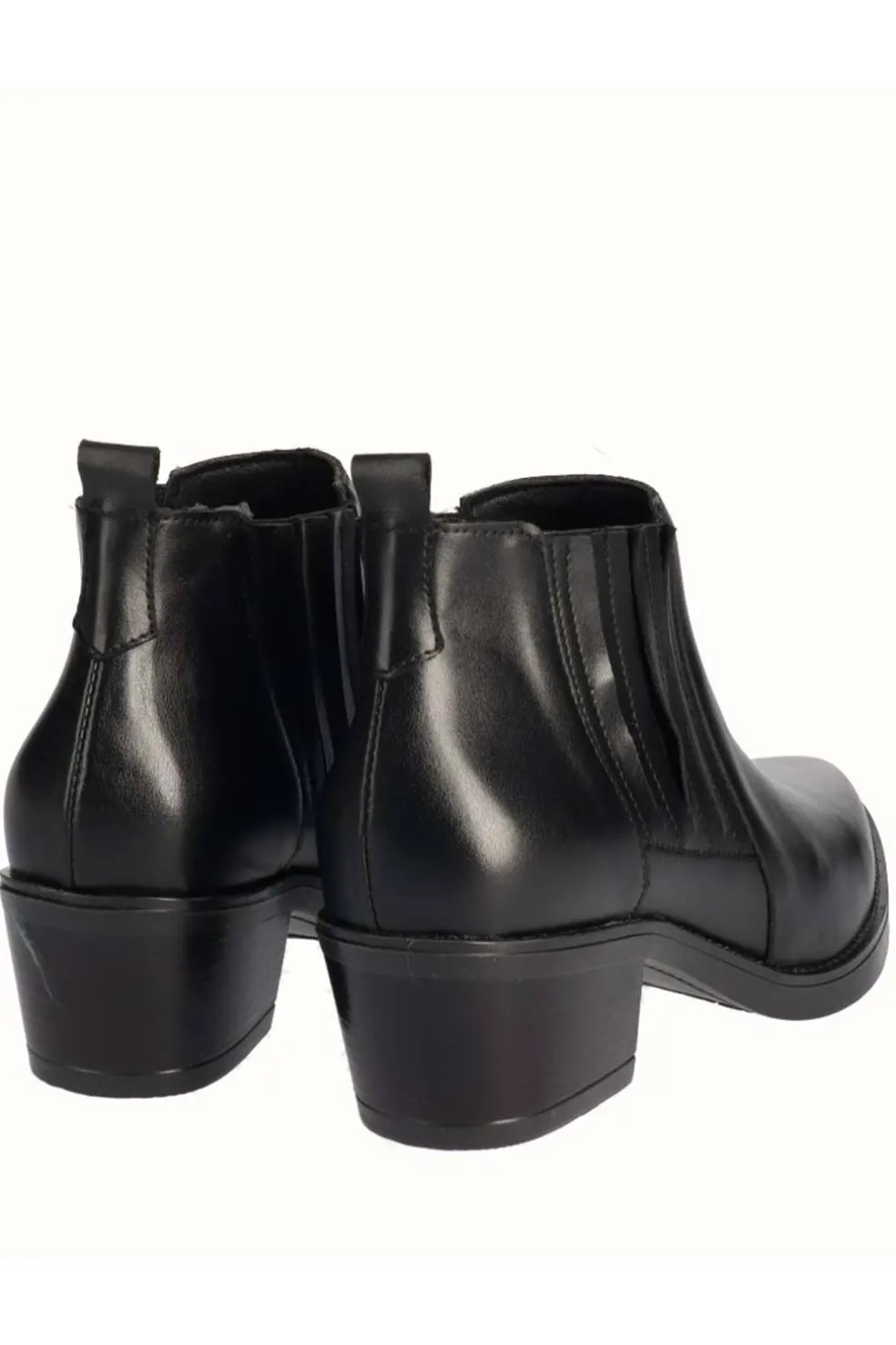 Botín de piel Viguera en color negro, elaborado en piel lisa de alta calidad con acabado elegante y versátil. Presenta gomas elásticas en los laterales que facilitan el calce y aportan comodidad en cada paso. Su tacón cuadrado de 5,5 cm ofrece altura y estabilidad, mientras que la caña de 15 cm proporciona sujeción sin perder ligereza. Un diseño de estilo atemporal, perfecto para combinar con looks casuales o más formales durante la temporada.