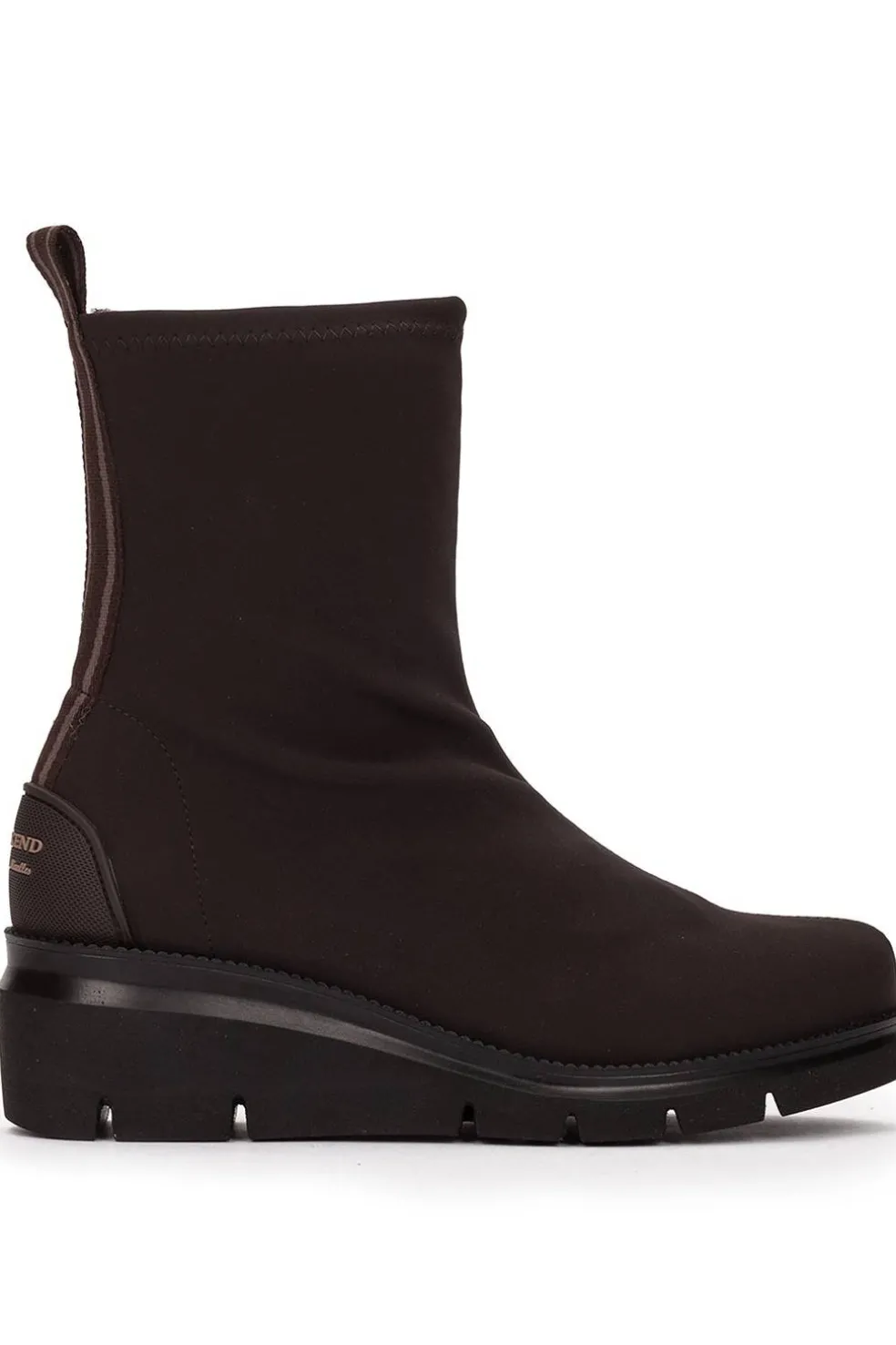Botines de tejido elástico efecto ante de color marron. Los botines con plataforma de ante elástico combinan elegancia y comodidad. Una opción moderna y chic para aportar un toque casual a tus outfits.