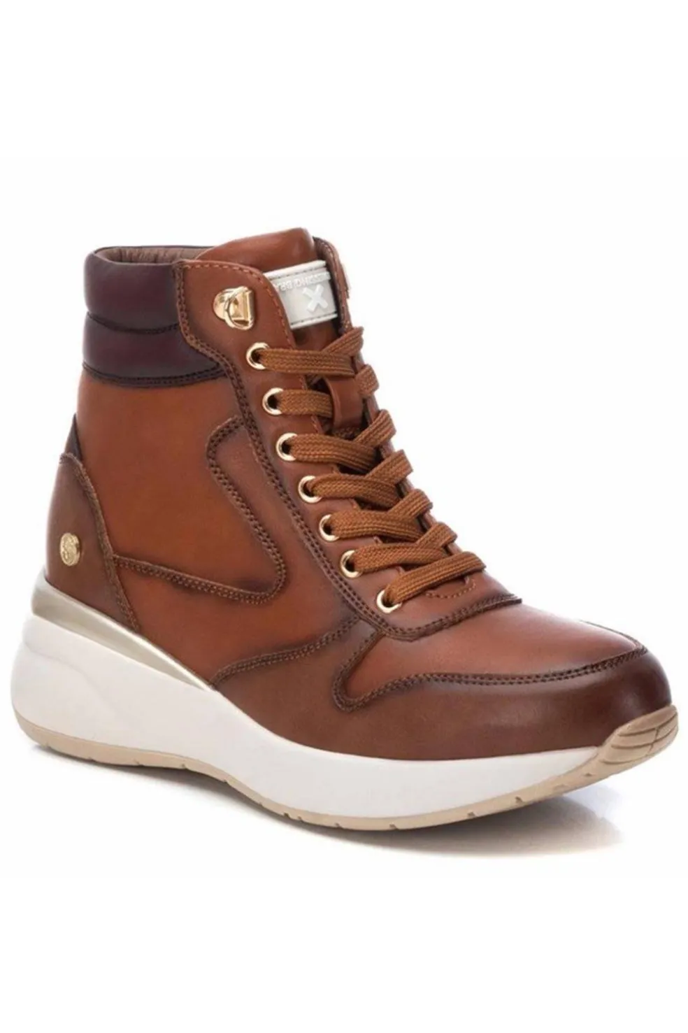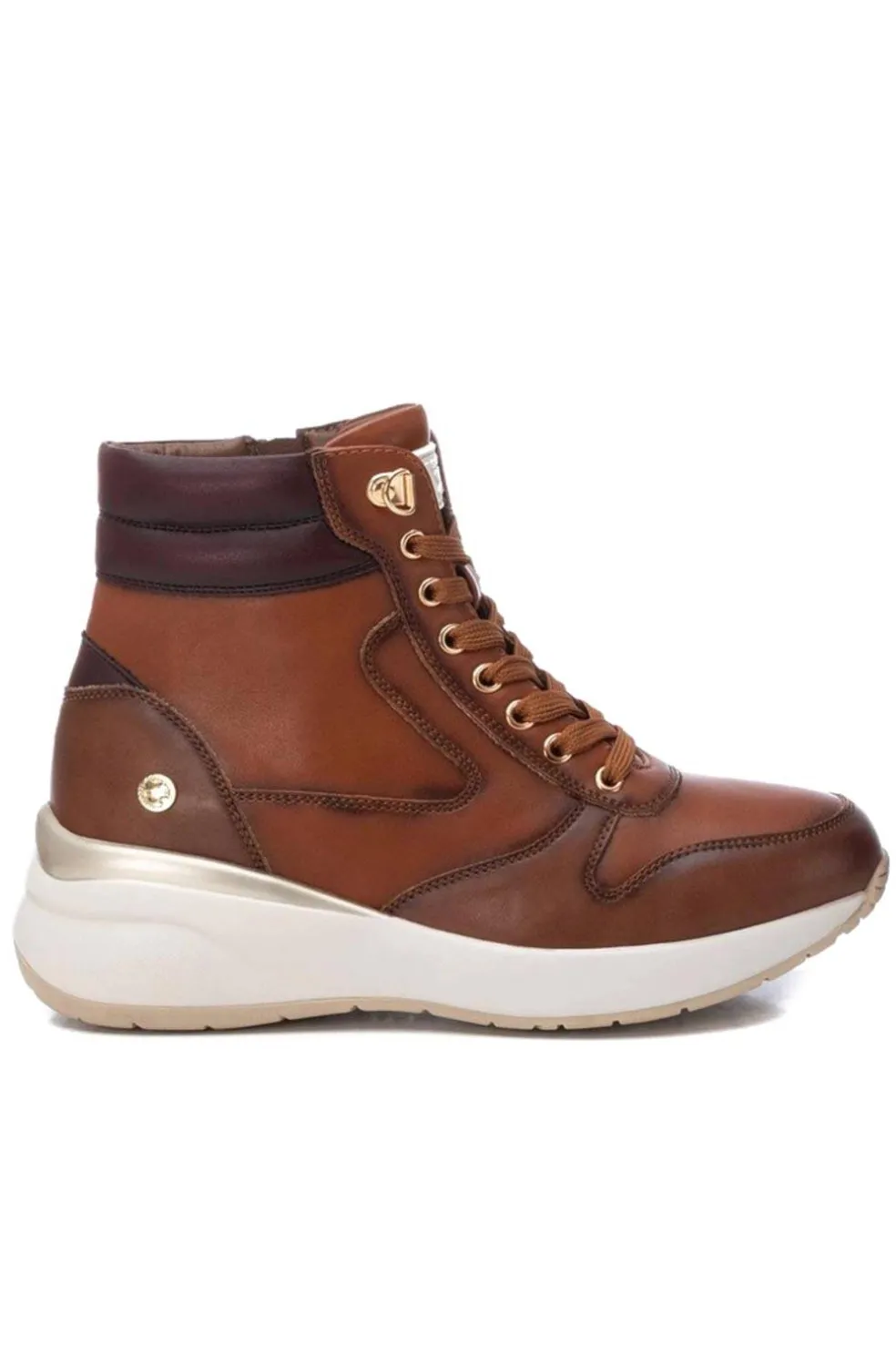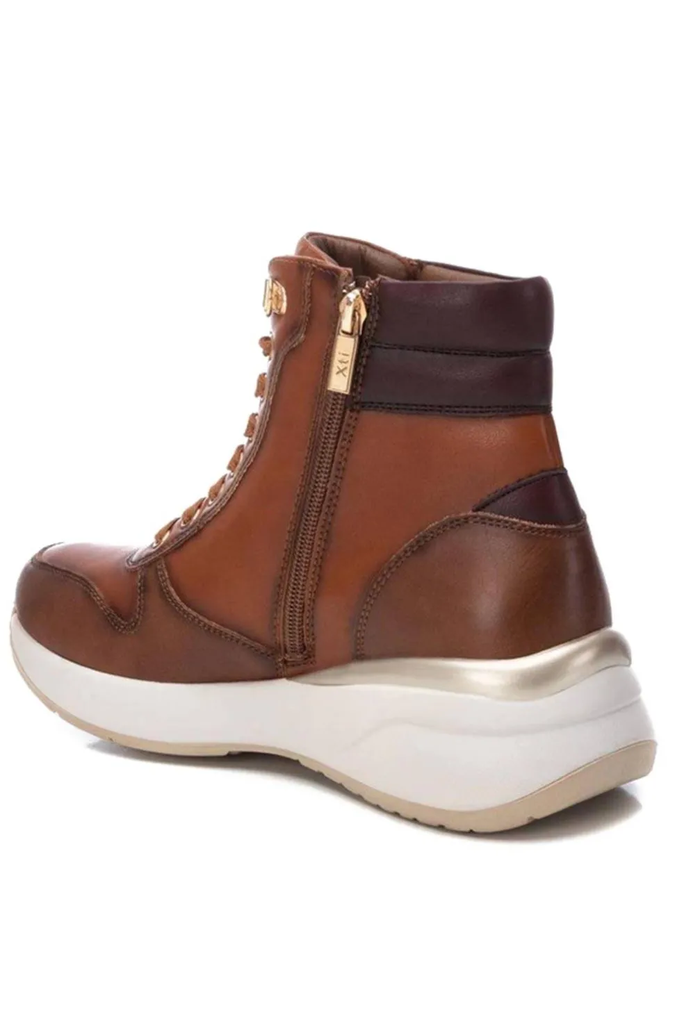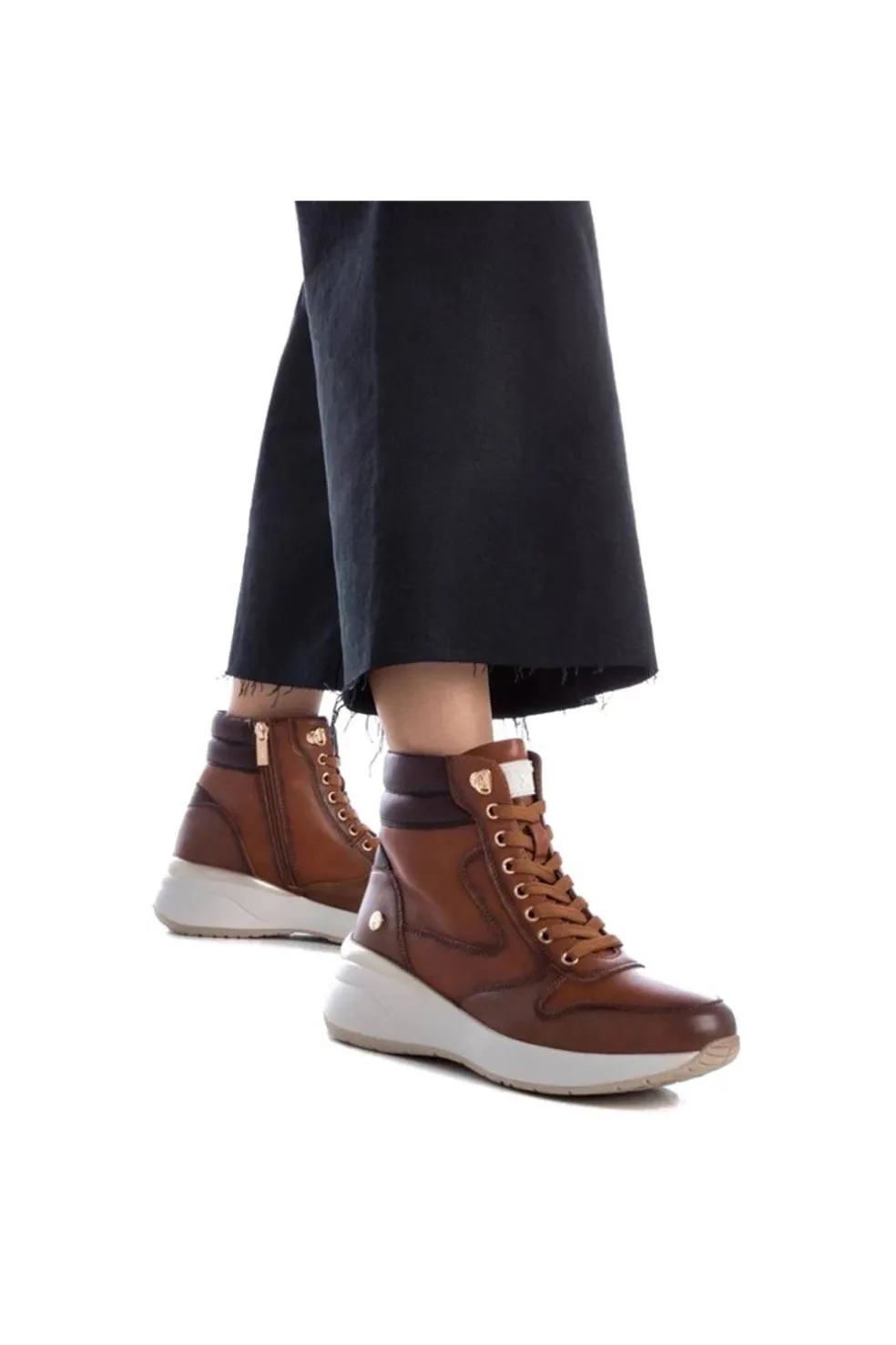 Botín de mujer, de la marca Xti. Fabricada en un material que imita la piel. Cierre mediante cremallera lateral y cordones ajustables. Cómoda cuña de 4 cm con suela de goma antideslizante. Para elevar unos cm a tu look de invierno.