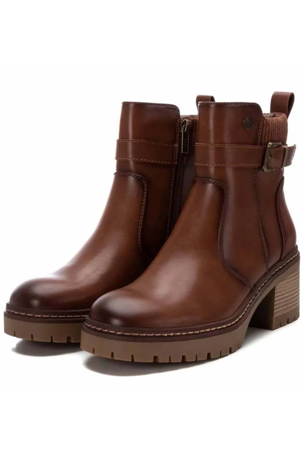 Botín de mujer, de la marca de Xti. Fabricada en material que imita la piel. Botín casual estilo motorista. Cierre cremallera para facilitar su puesta. Hebilla decorativa. Suela antideslizante y tacón de 6 cm.