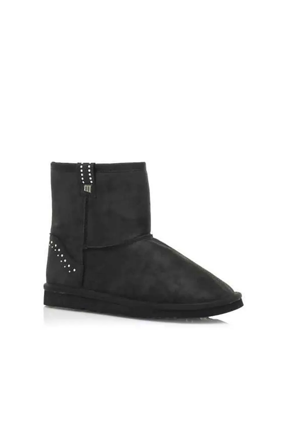 Botín de mujer en color negro de pelo, con detalle de tachuelas en el talón y en los laterales. Suela de goma dentada para mayor comodidad de 2 centímetros aproximadamente. Forro interno de pelo sintético que aporta la calidez que necesitas este invierno.