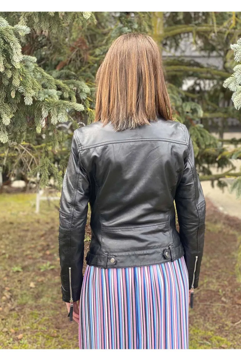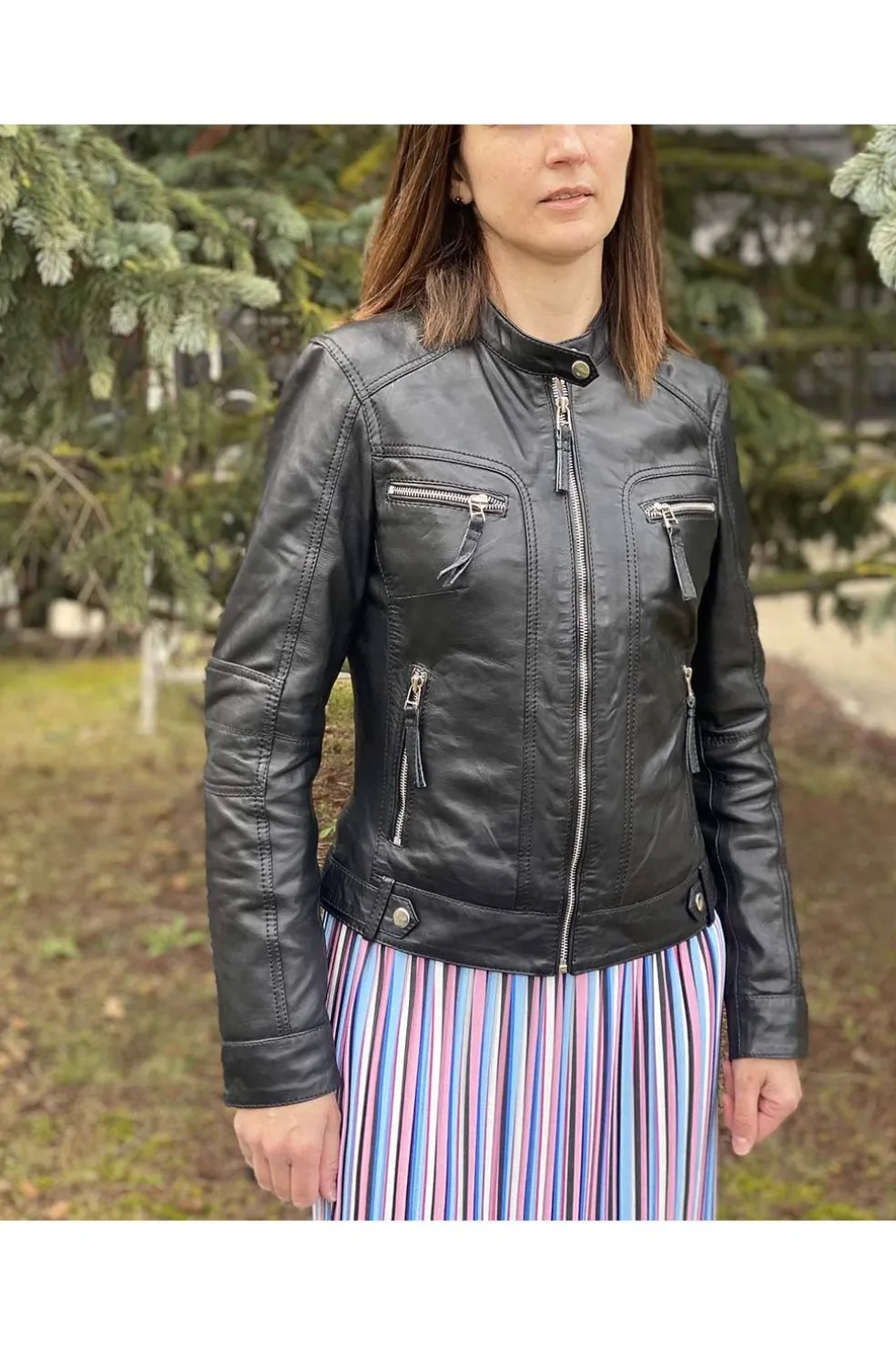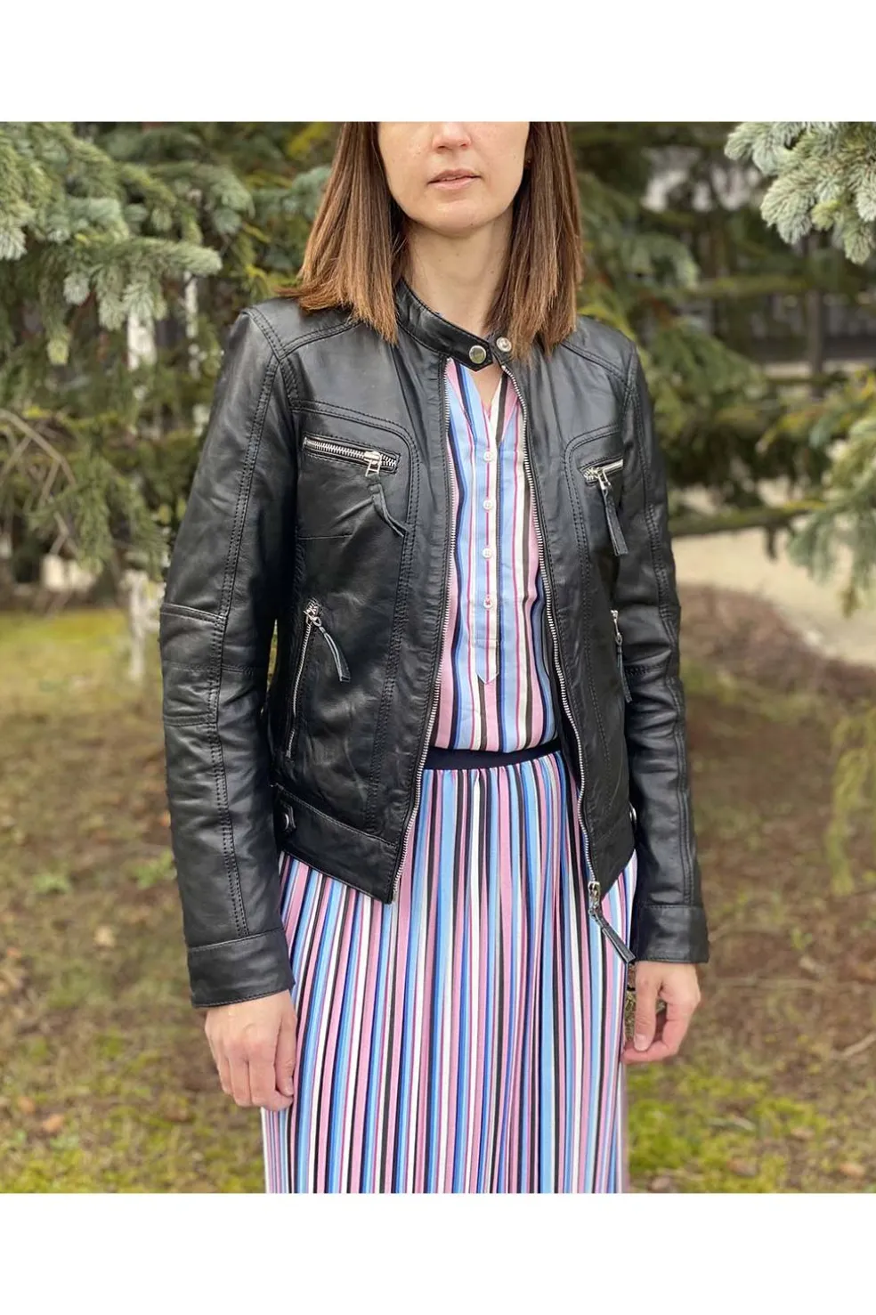 Cazadora de cuero natural de piel muy suave y ligera. Cuello tira con corchete. Se abrocha con cremallera, al igual que los bolsillos y puños.