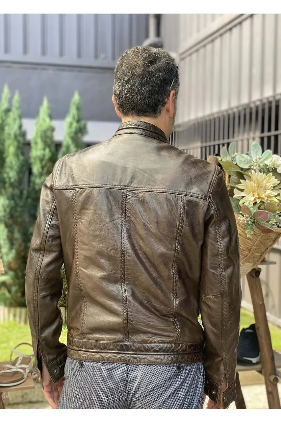 Cazadora de hombre en piel natural con cuello mao, bolsillos con cremallera. Piel muy suave y acabado vintage