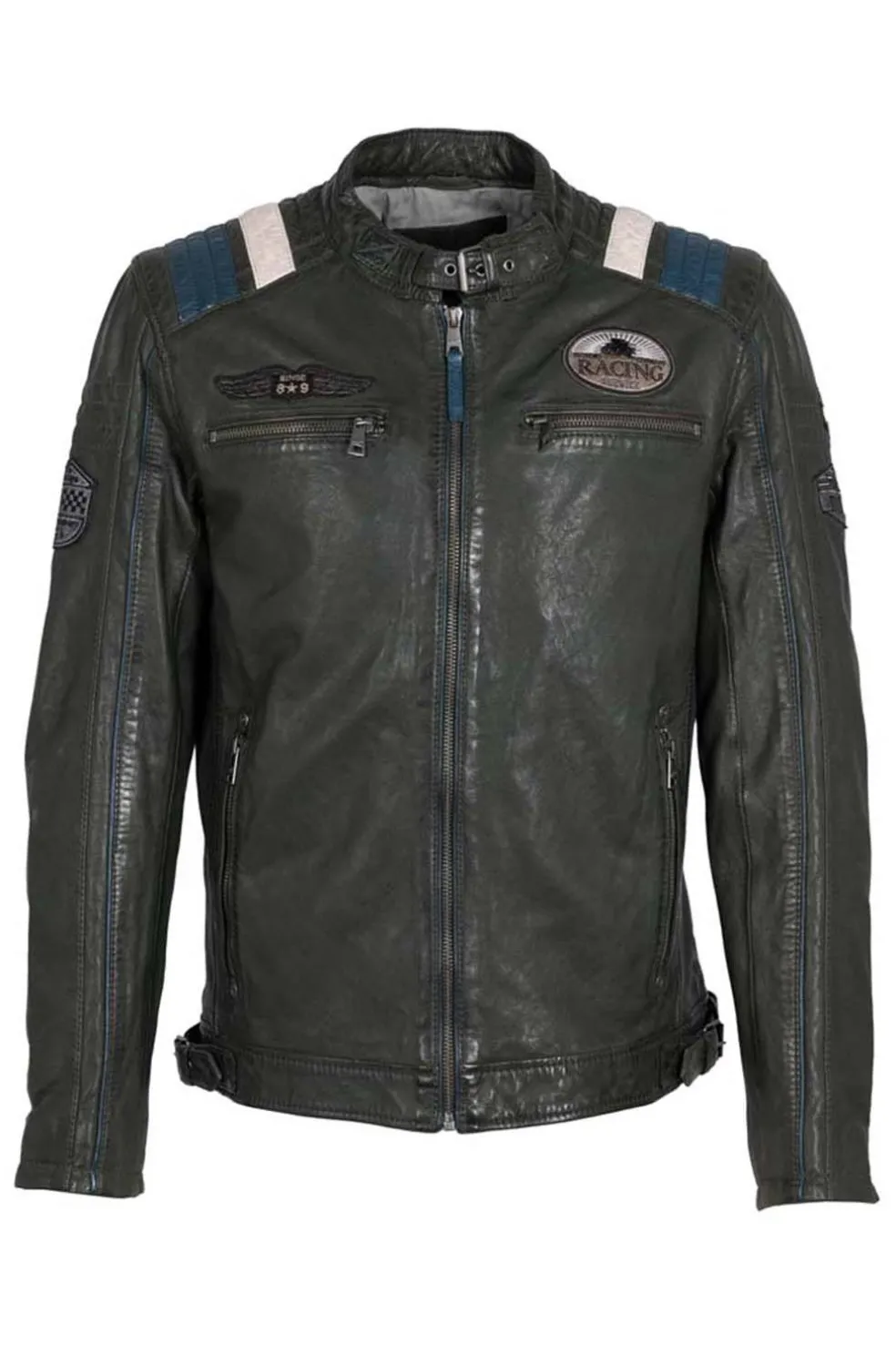 Esta cazadora de cuero de Mauritius, confeccionada en piel natural de cordero, ofrece un ajuste regular fit y un diseño moderno. Con bolsillos delanteros con cremallera y cremalleras en las mangas, destaca por sus franjas blancas y azules en el hombro sobre un elegante fondo verde efecto desgastado. Perfecta para añadir estilo a cualquier look.