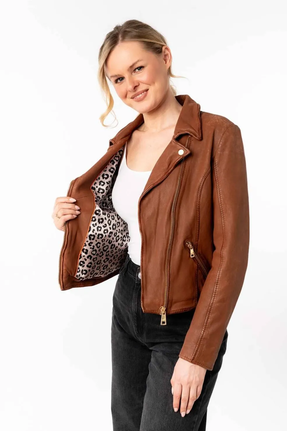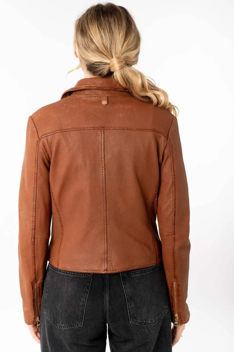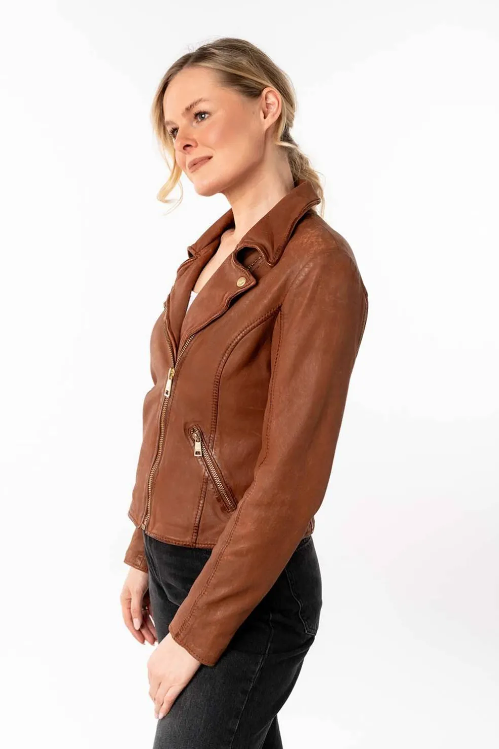 Cazadora de mujer mauritius Inessa en color whiskey con detalles cremalleras en color dorado