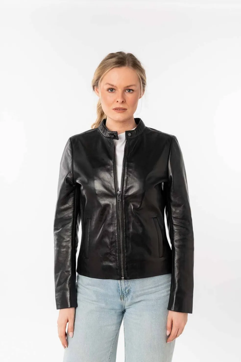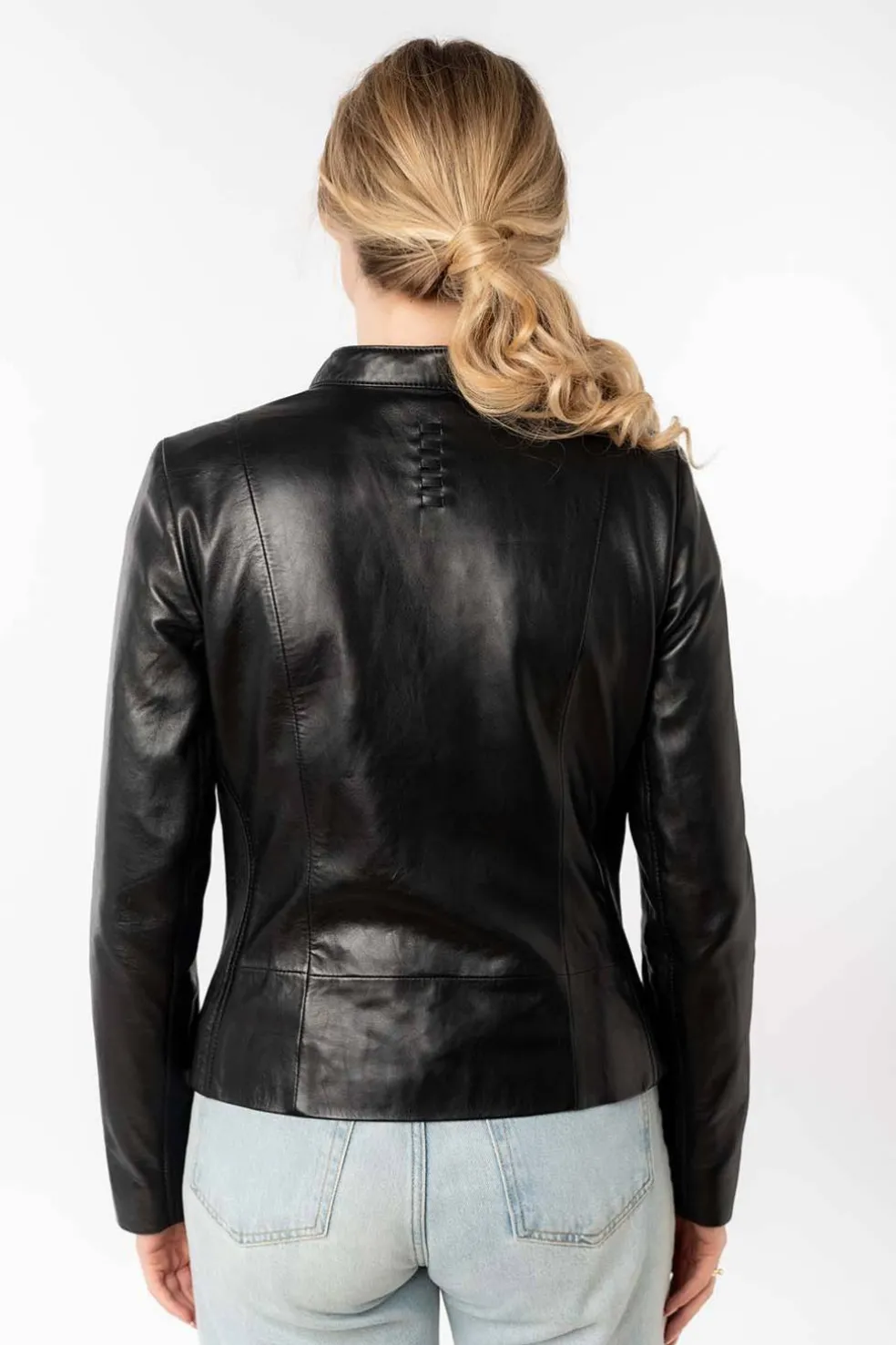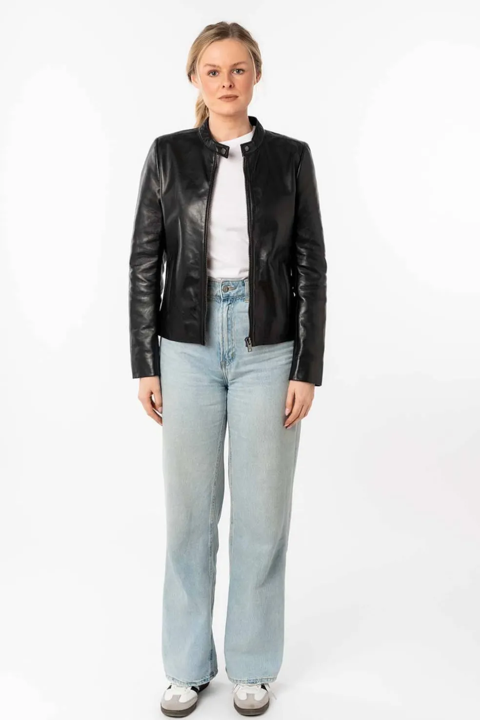 Descubre la cazadora de piel Mair en color negro de Mautiritius, diseñada para la mujer moderna que busca estilo y comodidad. Con una cremallera central y un corte slim fit, esta prenda se adapta perfectamente a tu figura. Su práctico bolsillo interior añade funcionalidad sin sacrificar el diseño. Ideal para cualquier ocasión, esta cazadora es el complemento perfecto para elevar tu look con un toque audaz y elegante.