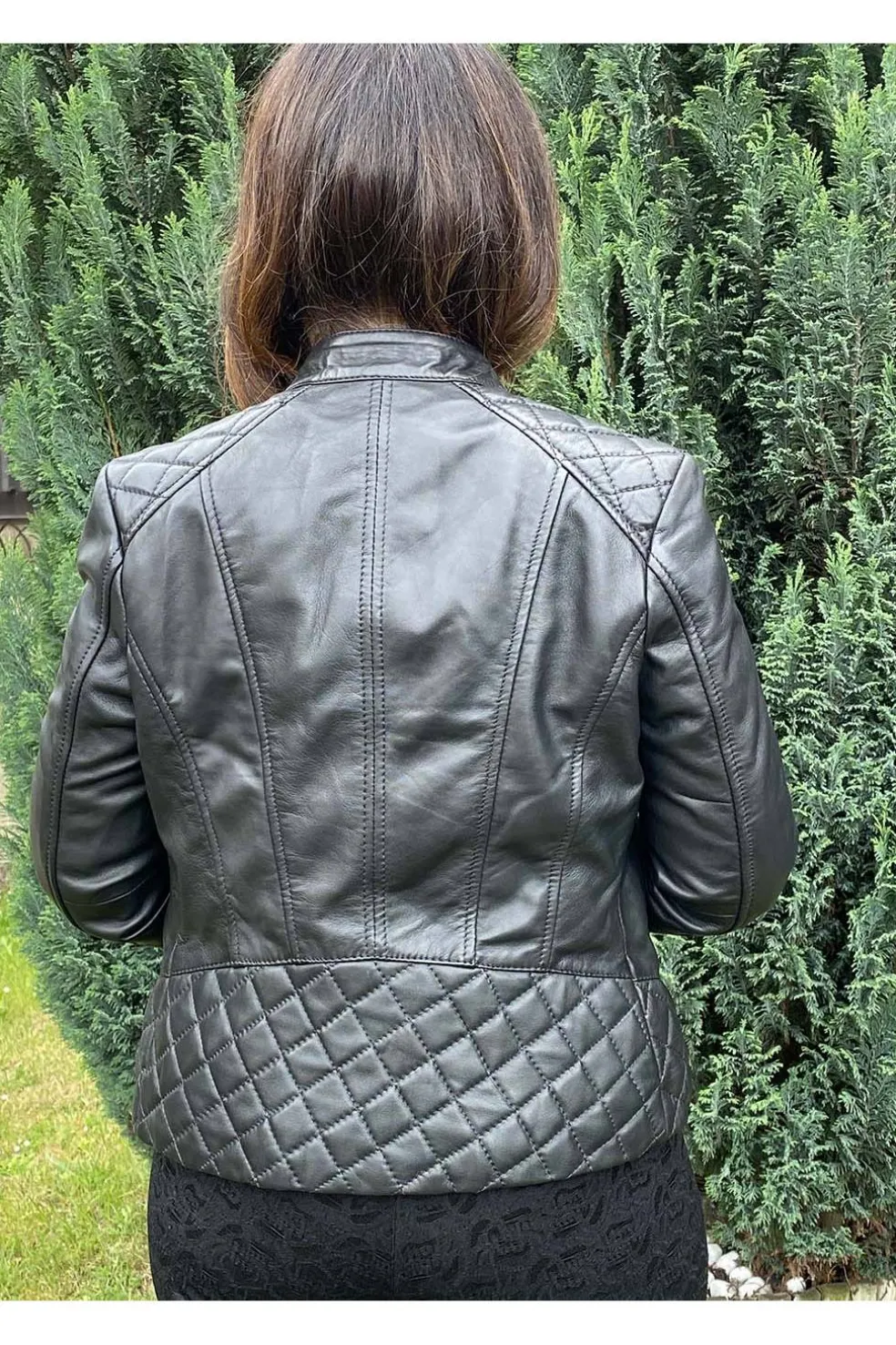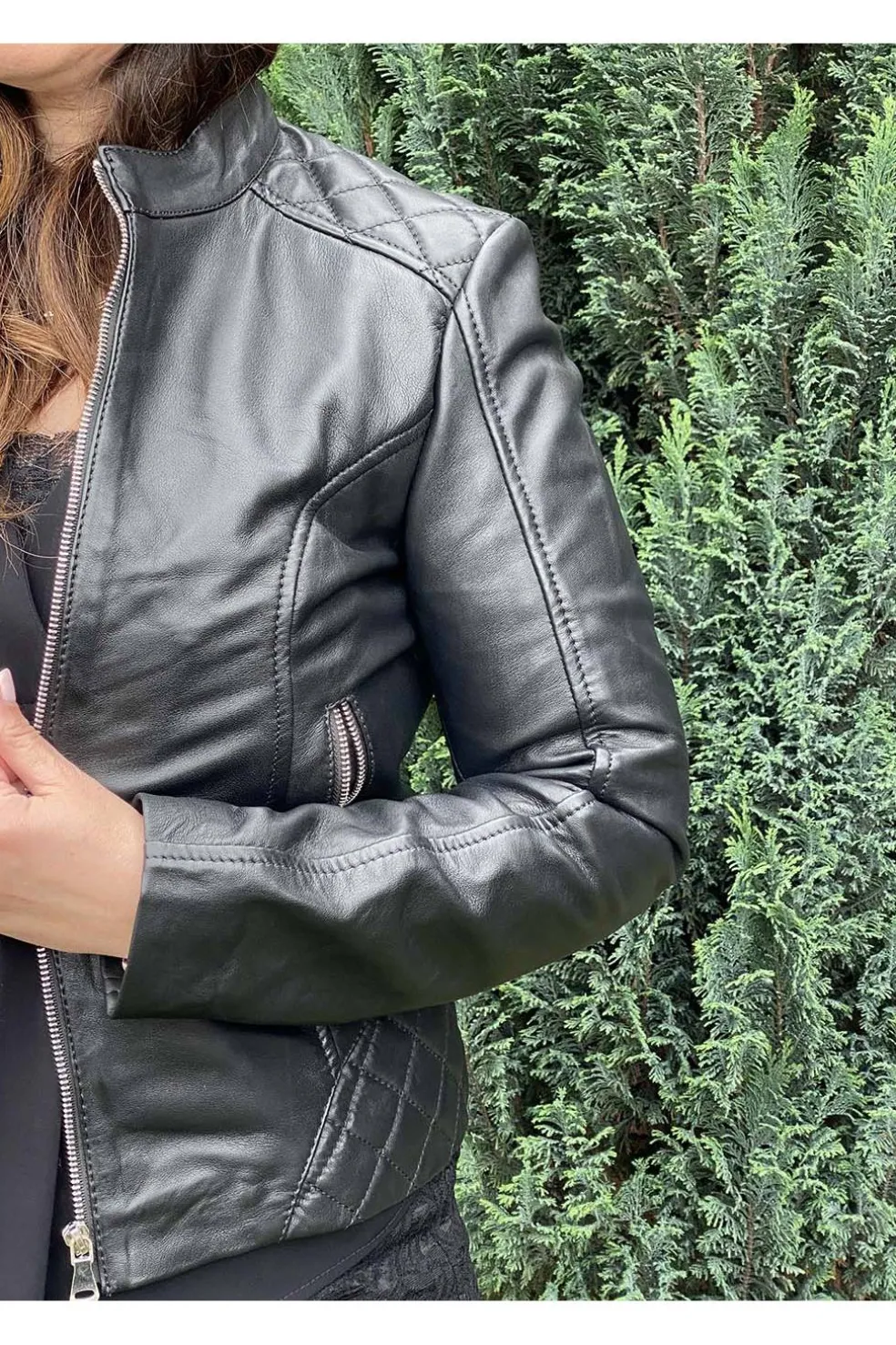 Cazadora de piel para mujer de la marca Medinapiel en color negro. Ligera y elegante, cuenta con cremallera central, bolsillos laterales con cremallera y detalles acolchados en hombros y espalda que aportan estilo y comodidad.