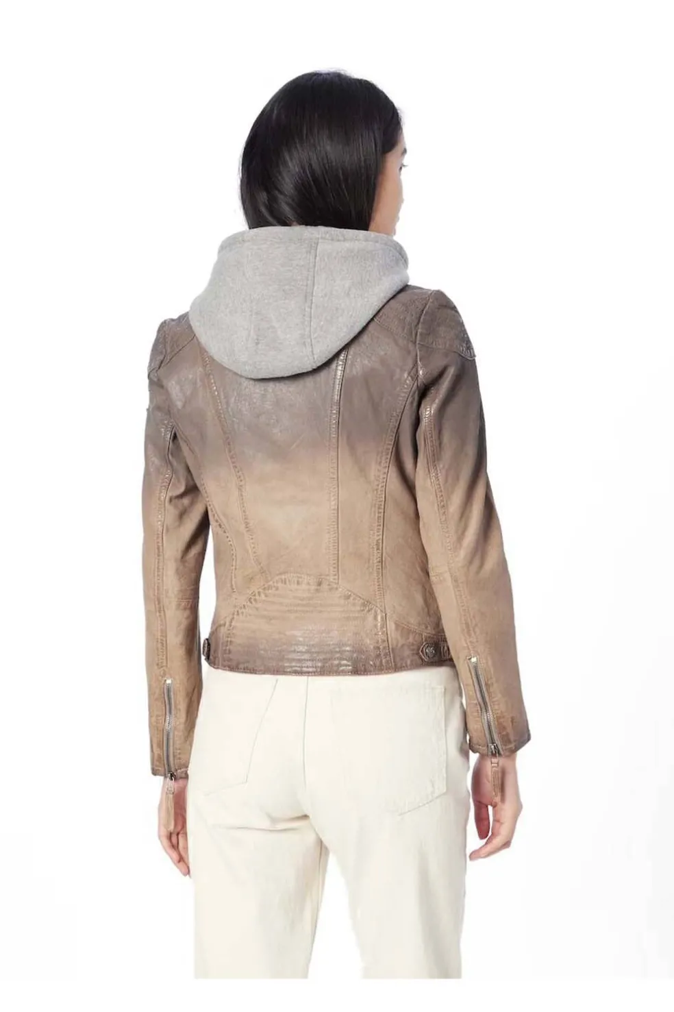 Cazadora de cuero natural con capucha de tejido desmontable, estilo motera . Exterior 100% piel. Largo: 53cm. Acabado vintage. Talla normal, patrón regular.
