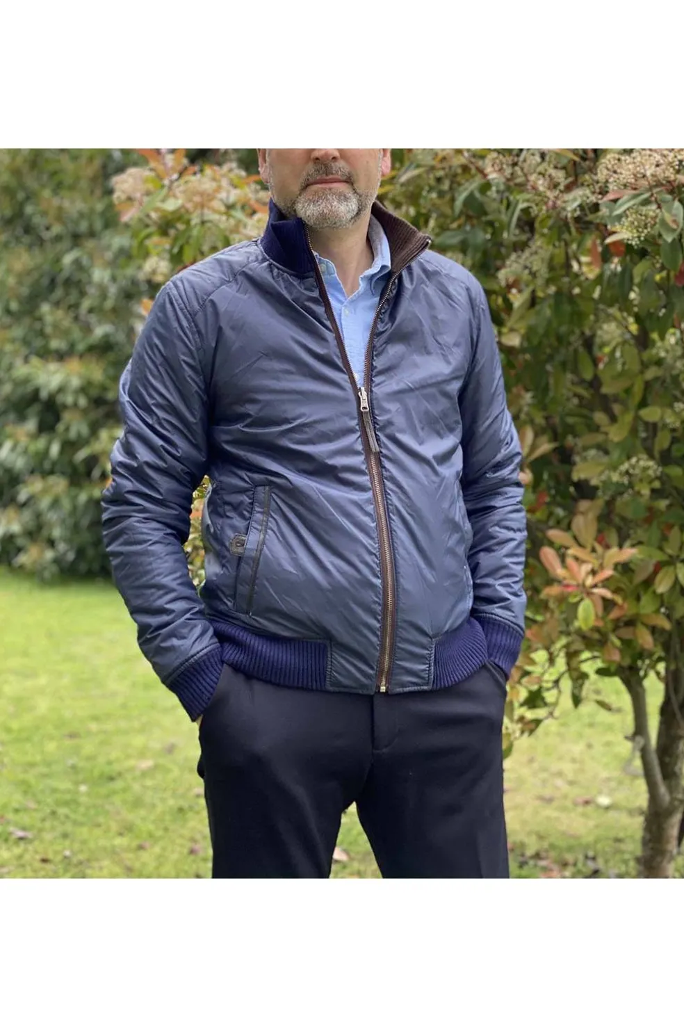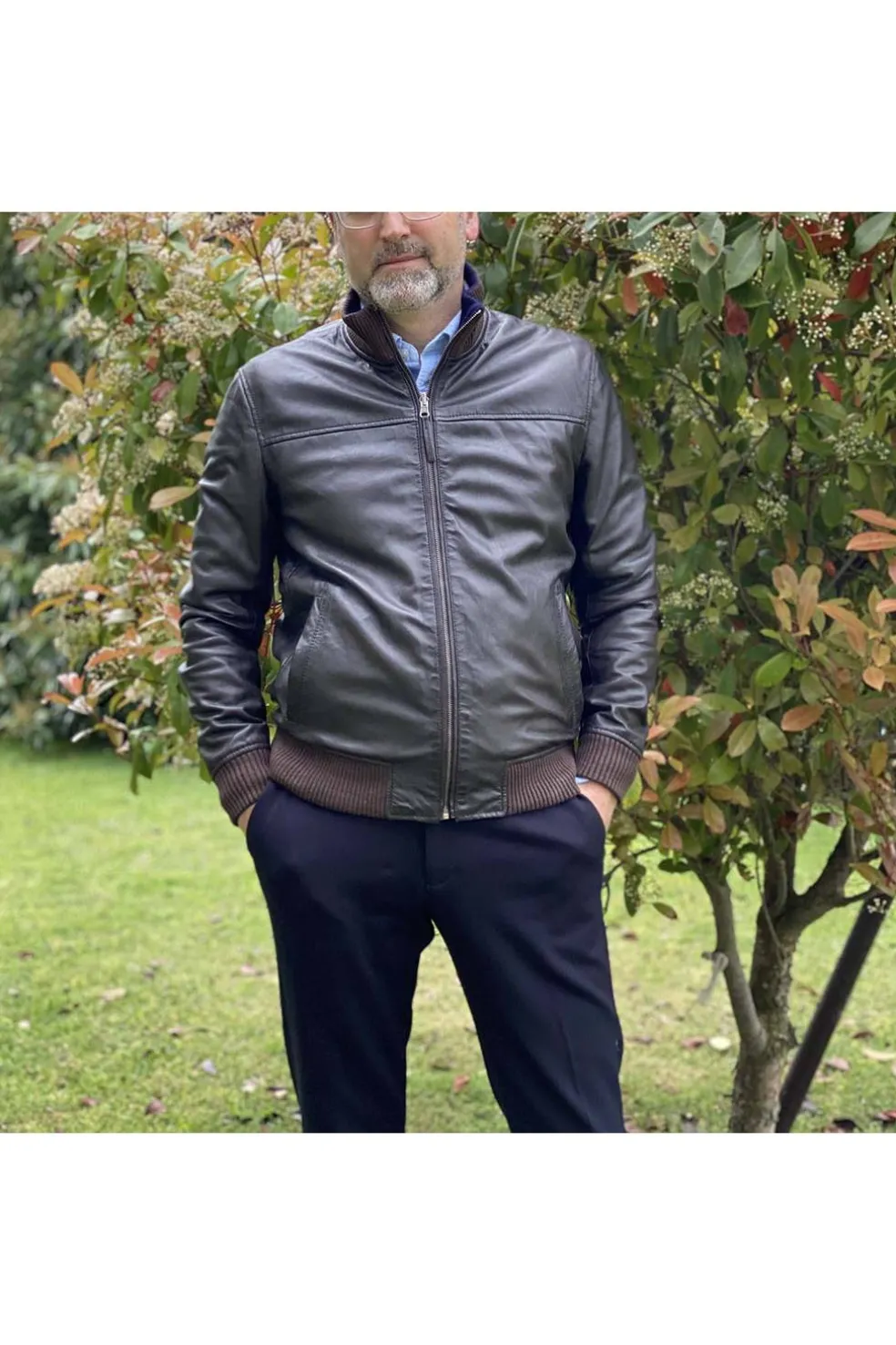 Cazadora de cuero natural, muy suave y ligera en color marrón . Es reversible , con un nylon en azul para que tengas dos prendas en una .