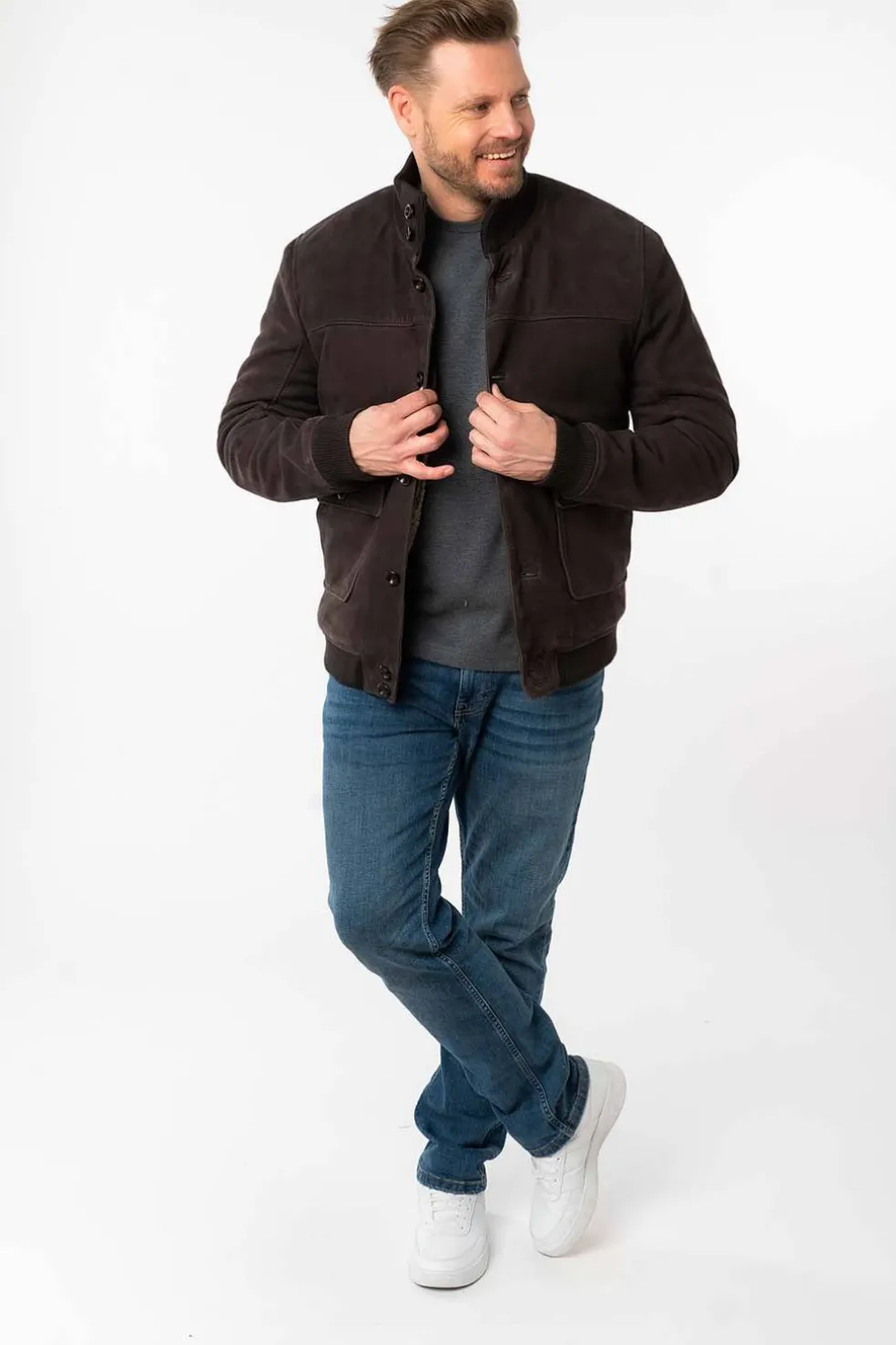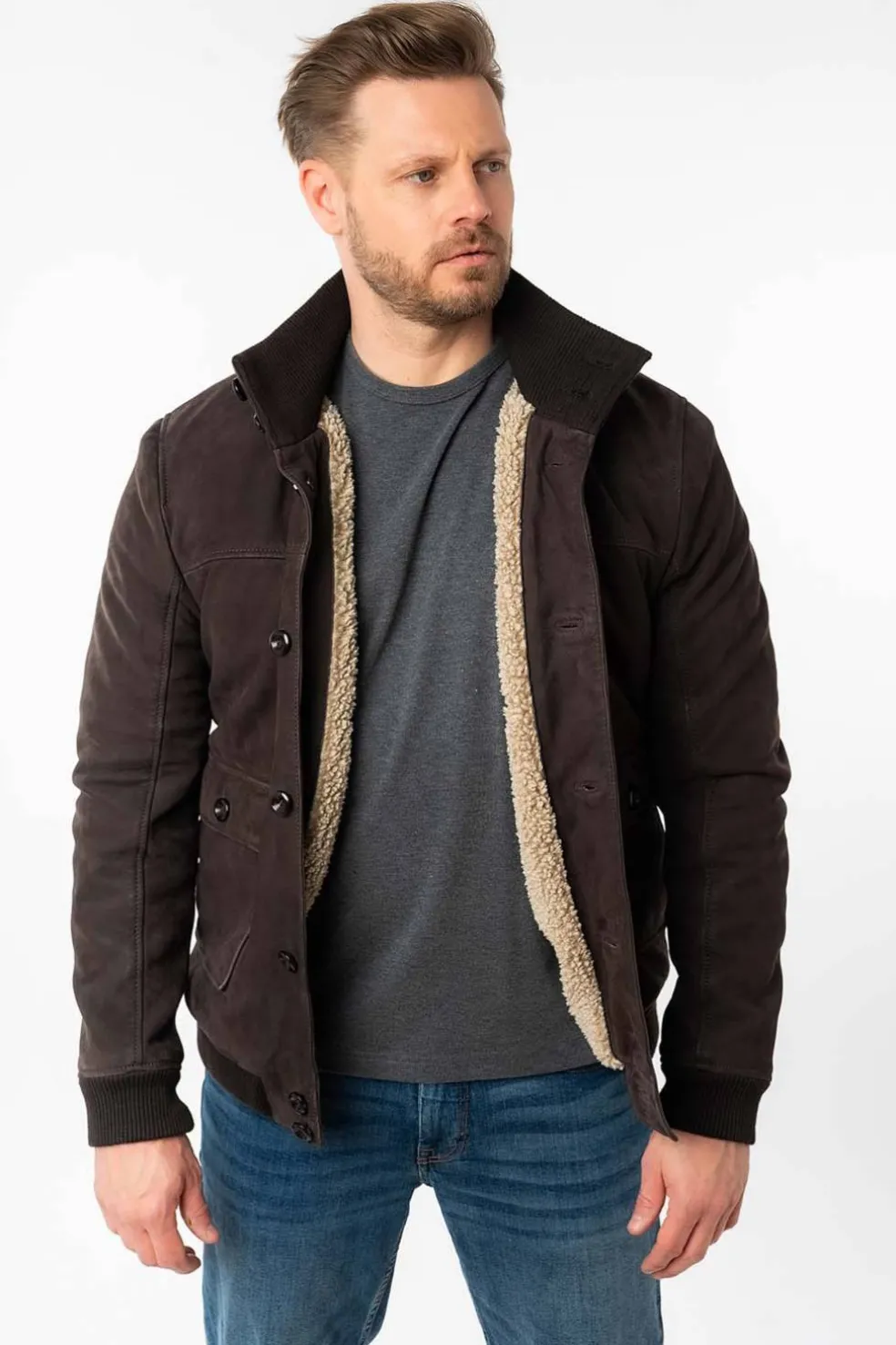 Cazadora de nobuck , es una piel anteada y muy suave con un acolchado interior de forro de borreguito muy cálido .