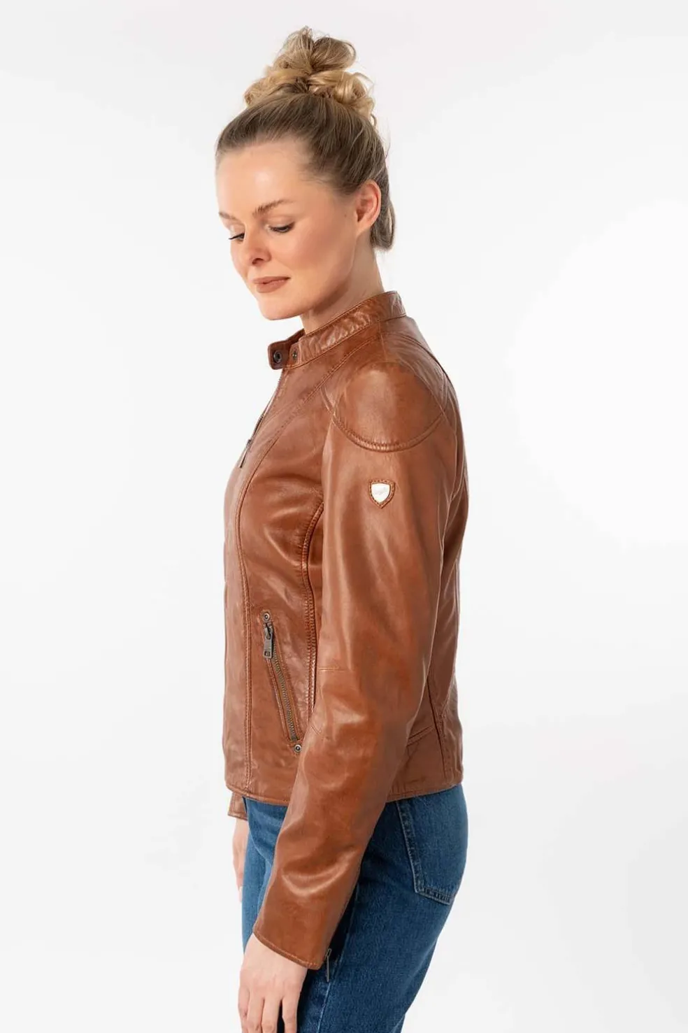 Cazadora de cuero estilo motero. Bolsillos laterales, cierre central y puños con cremallera. Largo de la prenda: 52 cm
