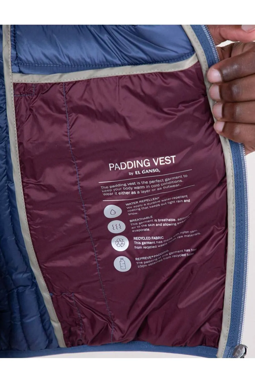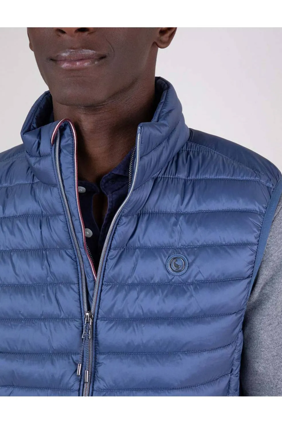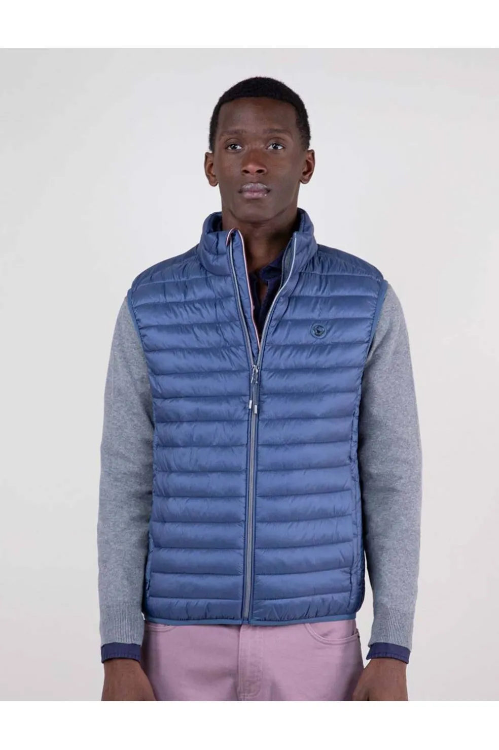 Chaleco de hombre acolchado de nylon reciclado repelente al agua. El patrón es Slim Fit, tiene una cremallera con un detalle de cinta de 3mm en el interior y una sisa elástica. Bolsillos con cremallera en la parte frontal y bolsillo interior. Logo metálico en el pecho.