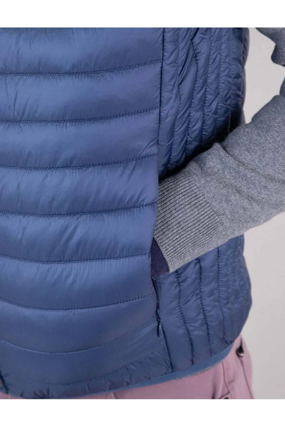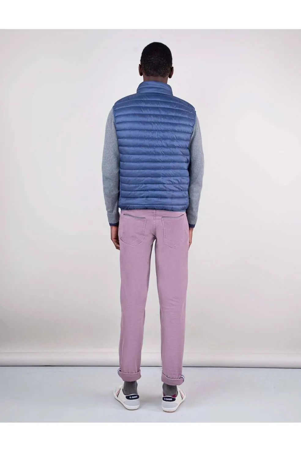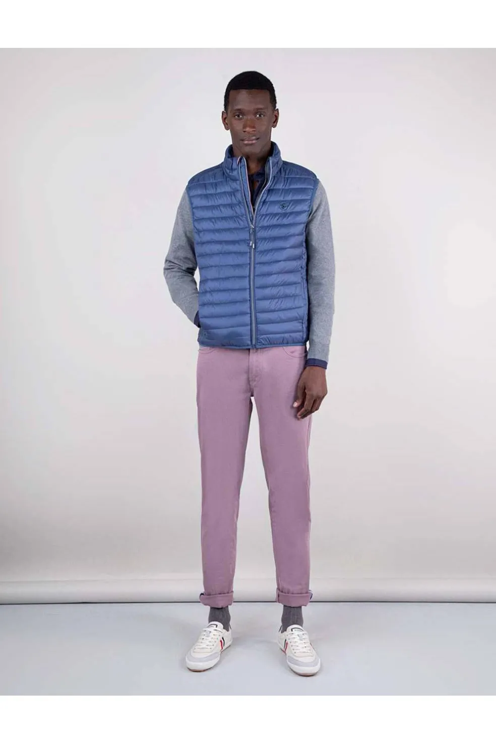 Chaleco de hombre acolchado de nylon reciclado repelente al agua. El patrón es Slim Fit, tiene una cremallera con un detalle de cinta de 3mm en el interior y una sisa elástica. Bolsillos con cremallera en la parte frontal y bolsillo interior. Logo metálico en el pecho.