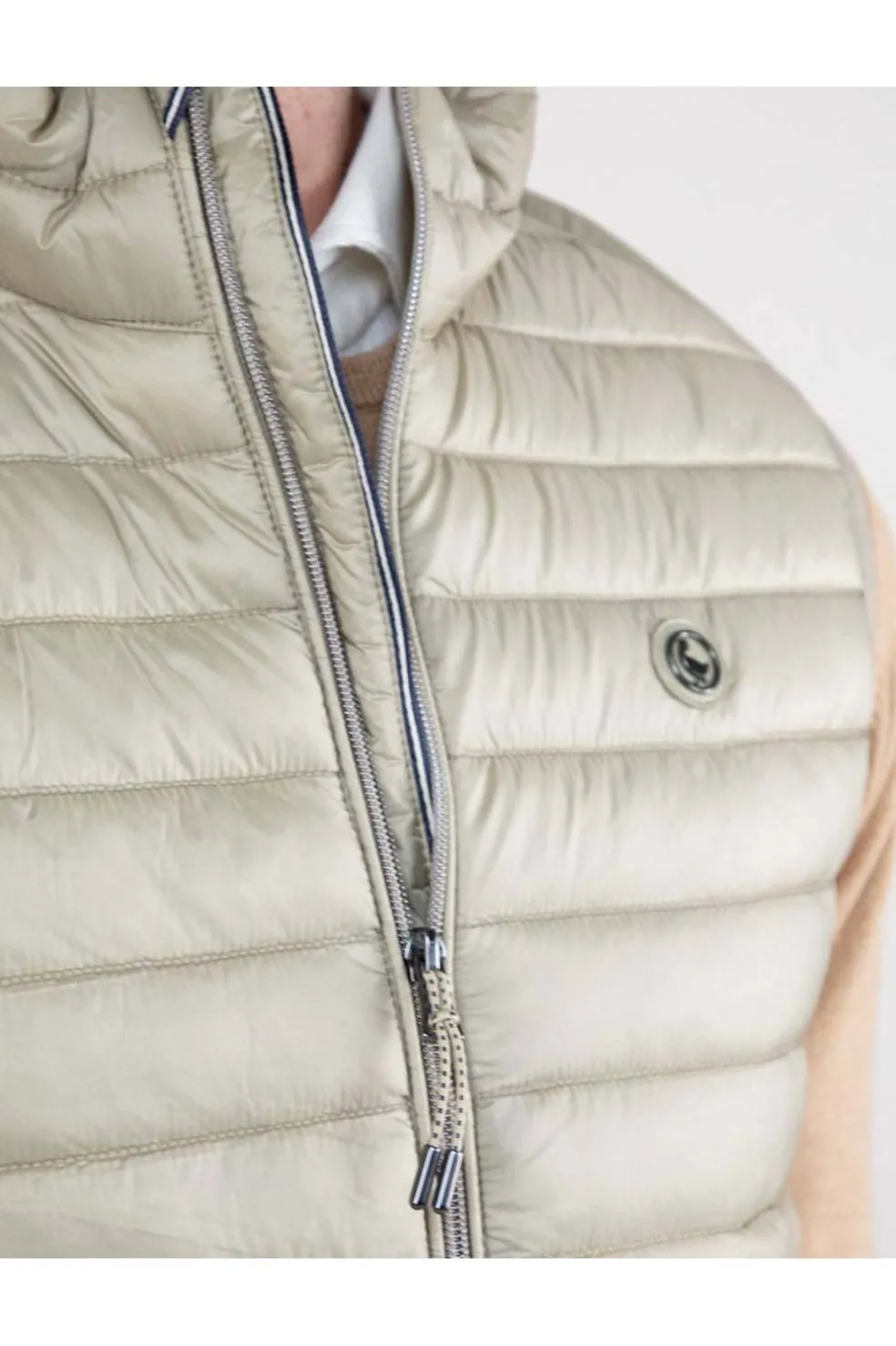 Chaleco de hombre acolchado de nylon reciclado repelente al agua. El patrón es Slim Fit, tiene una cremallera con un detalle de cinta de 3mm en el interior y una sisa elástica. Bolsillos con cremallera en la parte frontal y bolsillo interior. Logo metálico en el pecho.