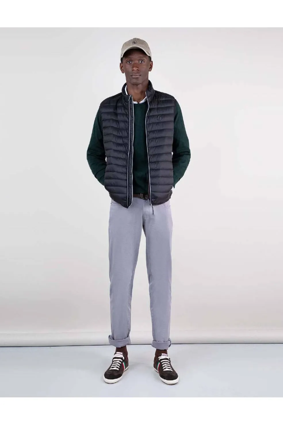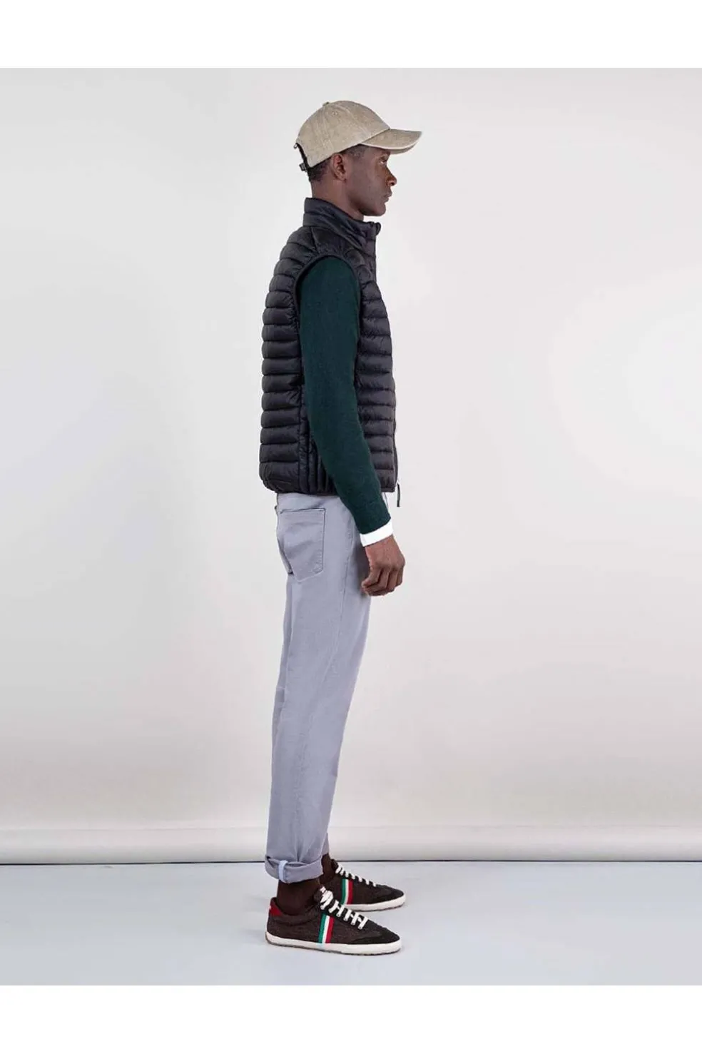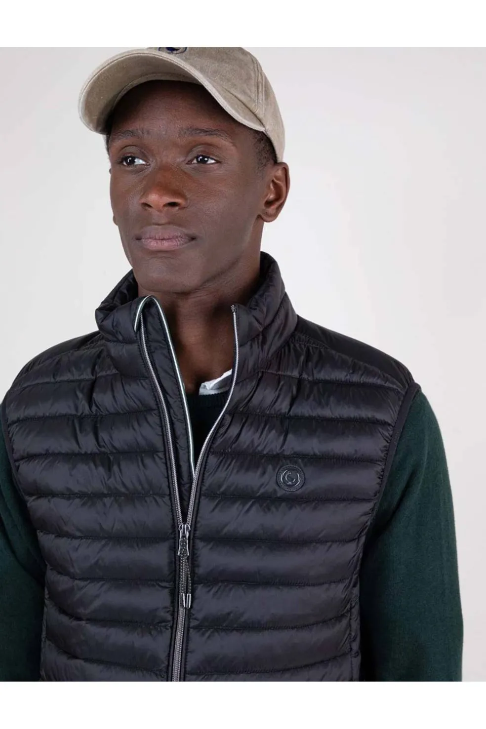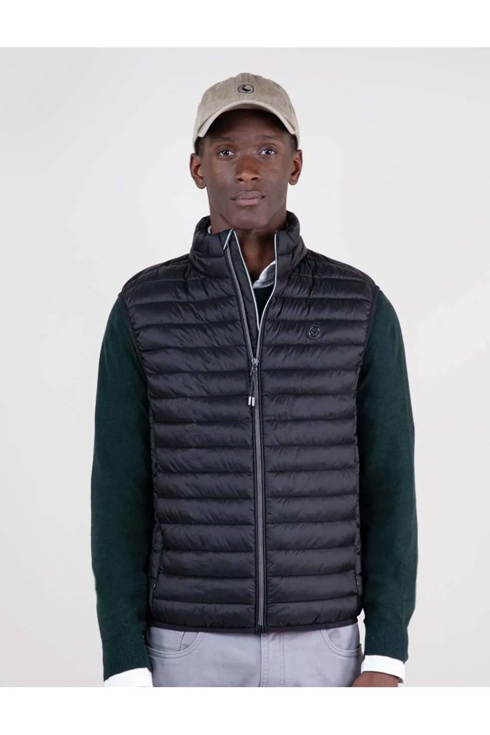 Chaleco de hombre acolchado de nylon reciclado repelente al agua. El patrón es Slim Fit, tiene una cremallera con un detalle de cinta de 3mm en el interior y una sisa elástica. Bolsillos con cremallera en la parte frontal y bolsillo interior. Logo metálico en el pecho.
