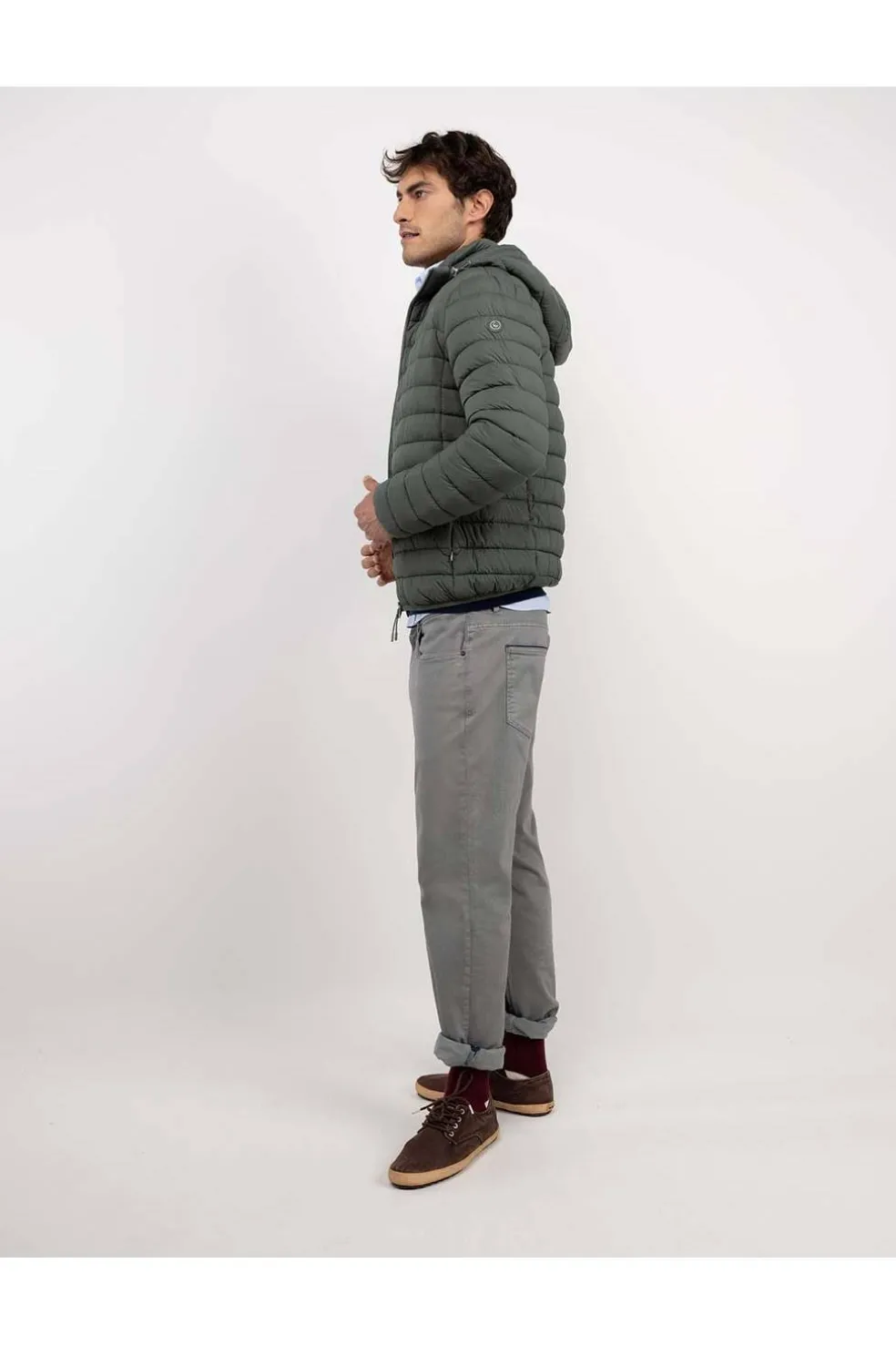 Chaqueta de hombre acolchada lisa confeccionada en tejido de nylon reciclado repelente al agua.