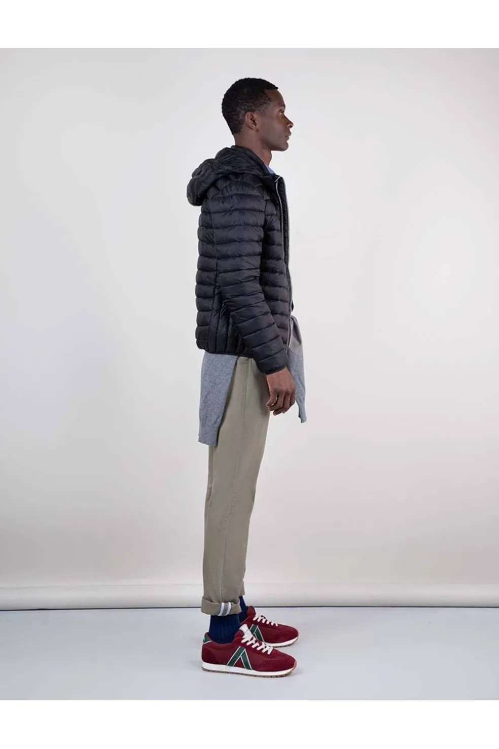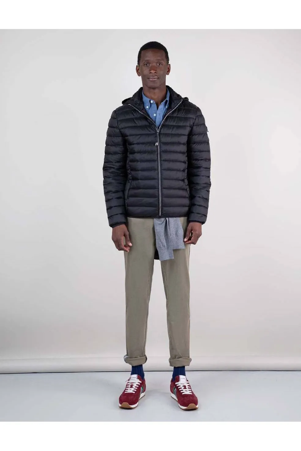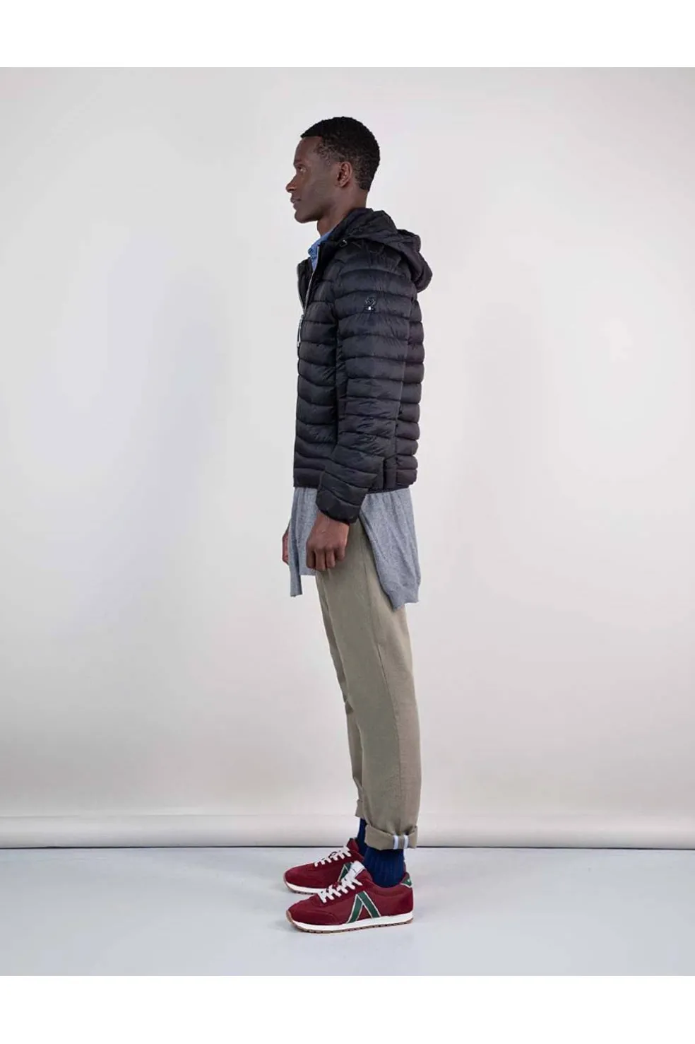 Chaqueta acolchada lisa confeccionada en tejido de nylon reciclado repelente al agua. Tiene un corte Slim Fit, cuello con capucha desmontable y cierre con cremallera con un detalle de bandera de 3mm en el interior. Manga larga, bolsillos laterales con cremallera y bolsillos interiores.