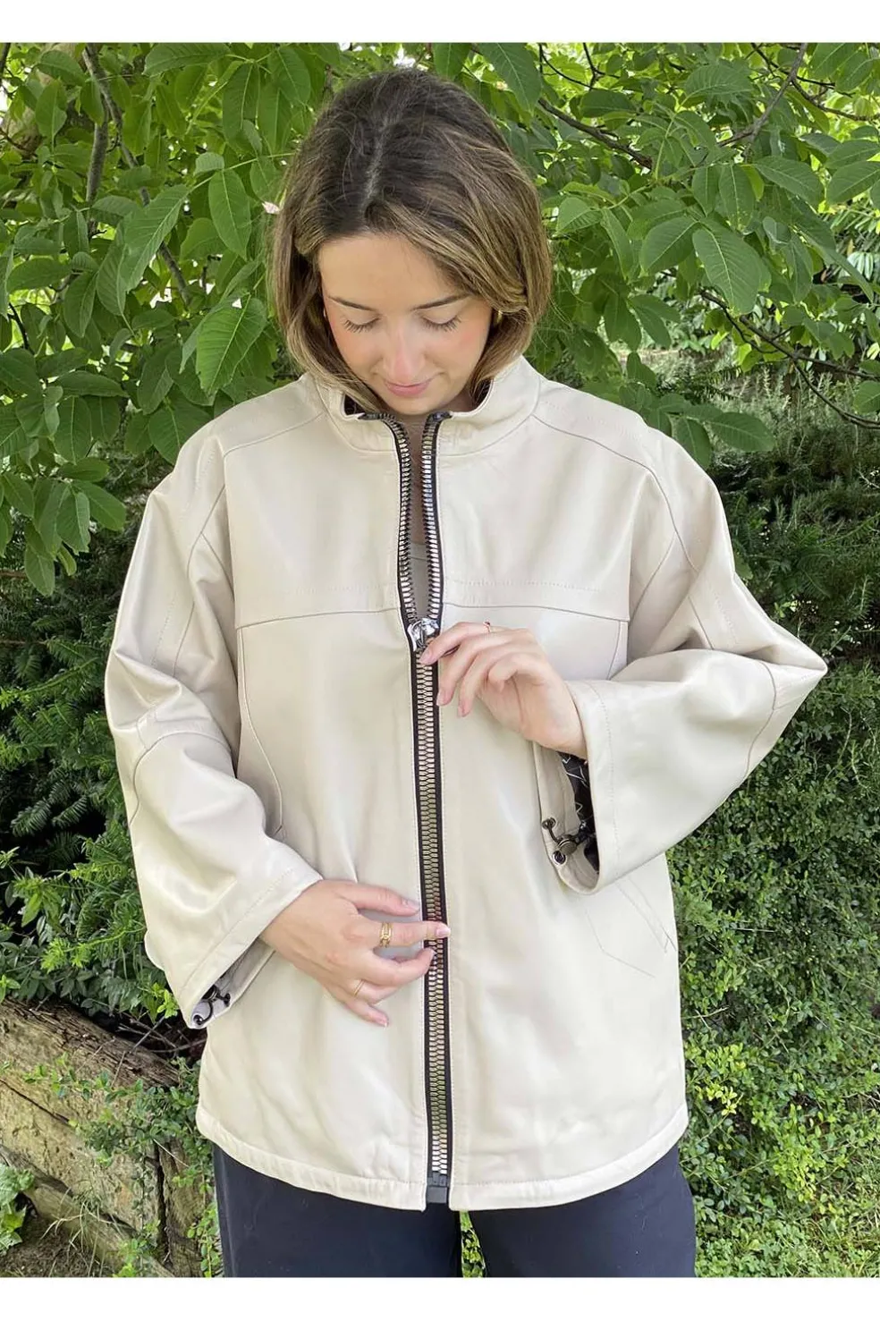 Minimalismo y elegancia se unen en esta chaqueta de piel de Medinapiel, pensada para mujeres que valoran el diseño depurado y la calidad en cada detalle. Confeccionada en piel natural de color beige, presenta un corte moderno y femenino, ideal para entretiempo. Su diseño incluye cierre central con cremallera, bolsillos laterales discretos, mangas 3/4 que aportan un aire sofisticado y una pequeña abertura trasera que ofrece comodidad y fluidez al movimiento. Una prenda ligera, versátil y refinada, perfecta para completar looks tanto casuales como más elegantes.