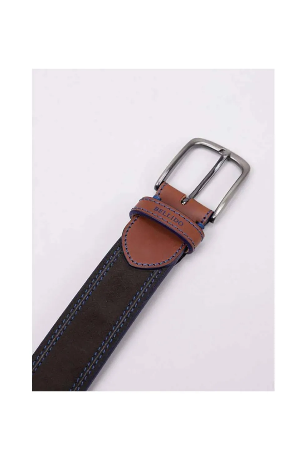 Cinturón en 38mm de piel de serraje combinado con piel de vacuno. El diseño de este modelo lo protagonizan los pespuntes en contraste con el color de la piel. Logotipo en color grabado a fuego en el pasador. Sistema sencillo de corte para ajustar a la medida deseada.