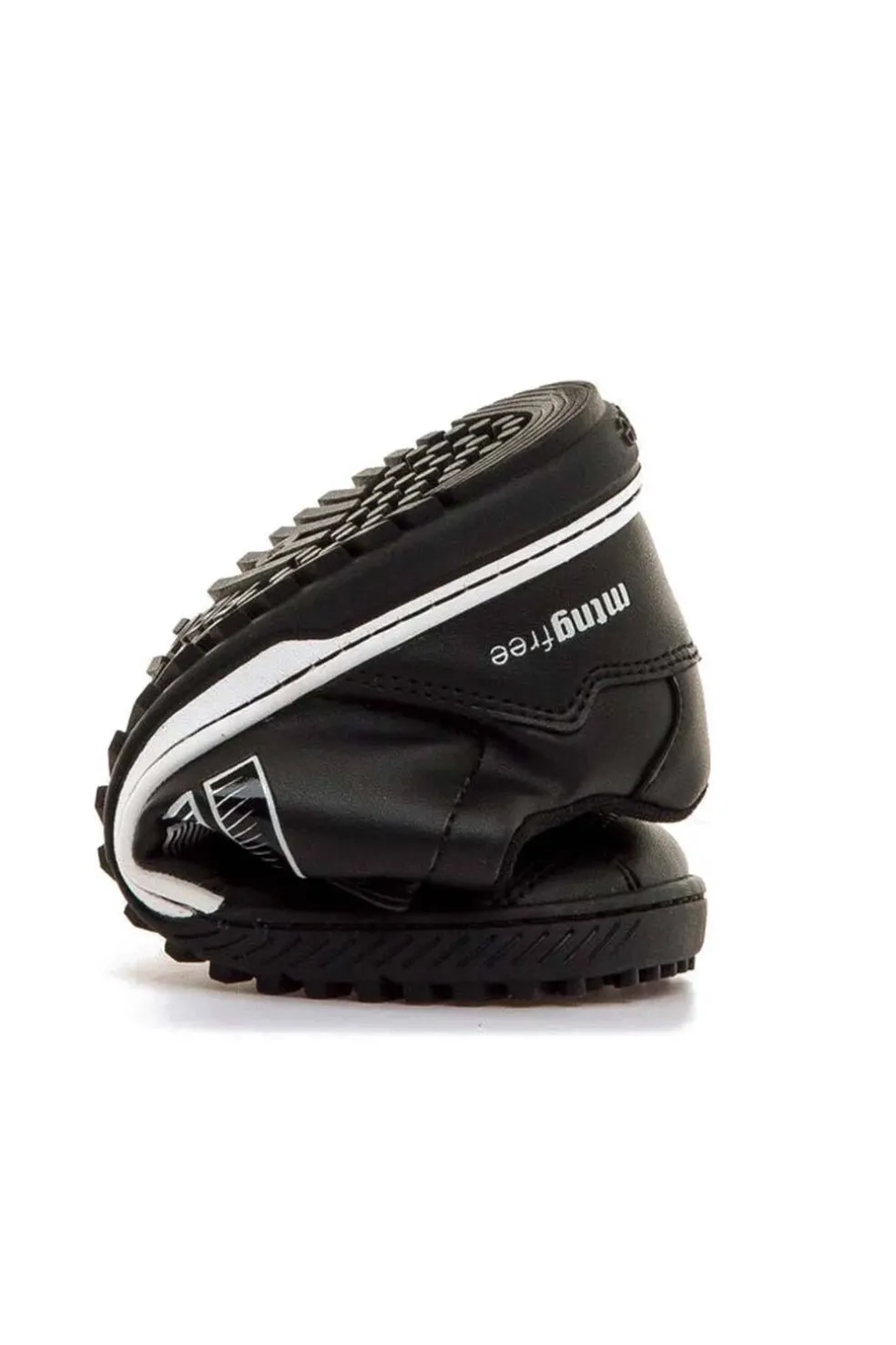 Zapatilla de fútbol barefoot de color negro con detalles blancos para niño de la marca Mustang, modelo Free Play. Dispone de cierre adherente con cosido reforzado y cordones elásticos que facilitan el ajuste. La suela de goma incluye pequeños tacos que mejoran la tracción y el agarre. Diseñado y desarrollado especialmente en colaboración con el Dr. Juanjo López, traumatólogo deportivo e infantil, para respetar el desarrollo natural del pie del niño y la niña.