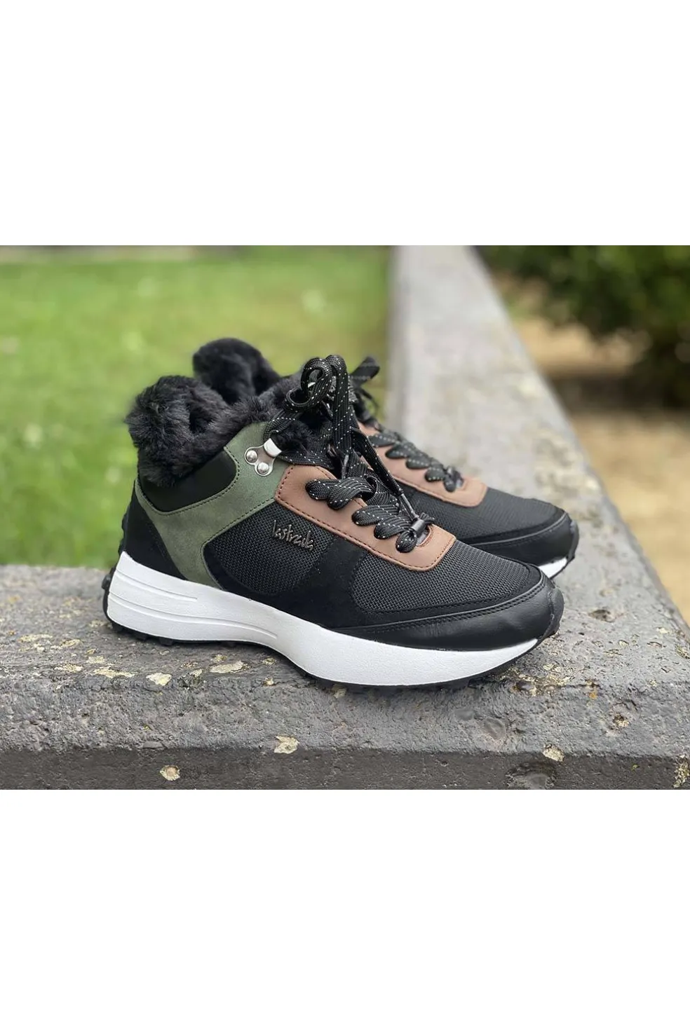 Deportivo de mujer en color negro, con un acabado en lona. Detalle pelo en la parte superior del tobillo.