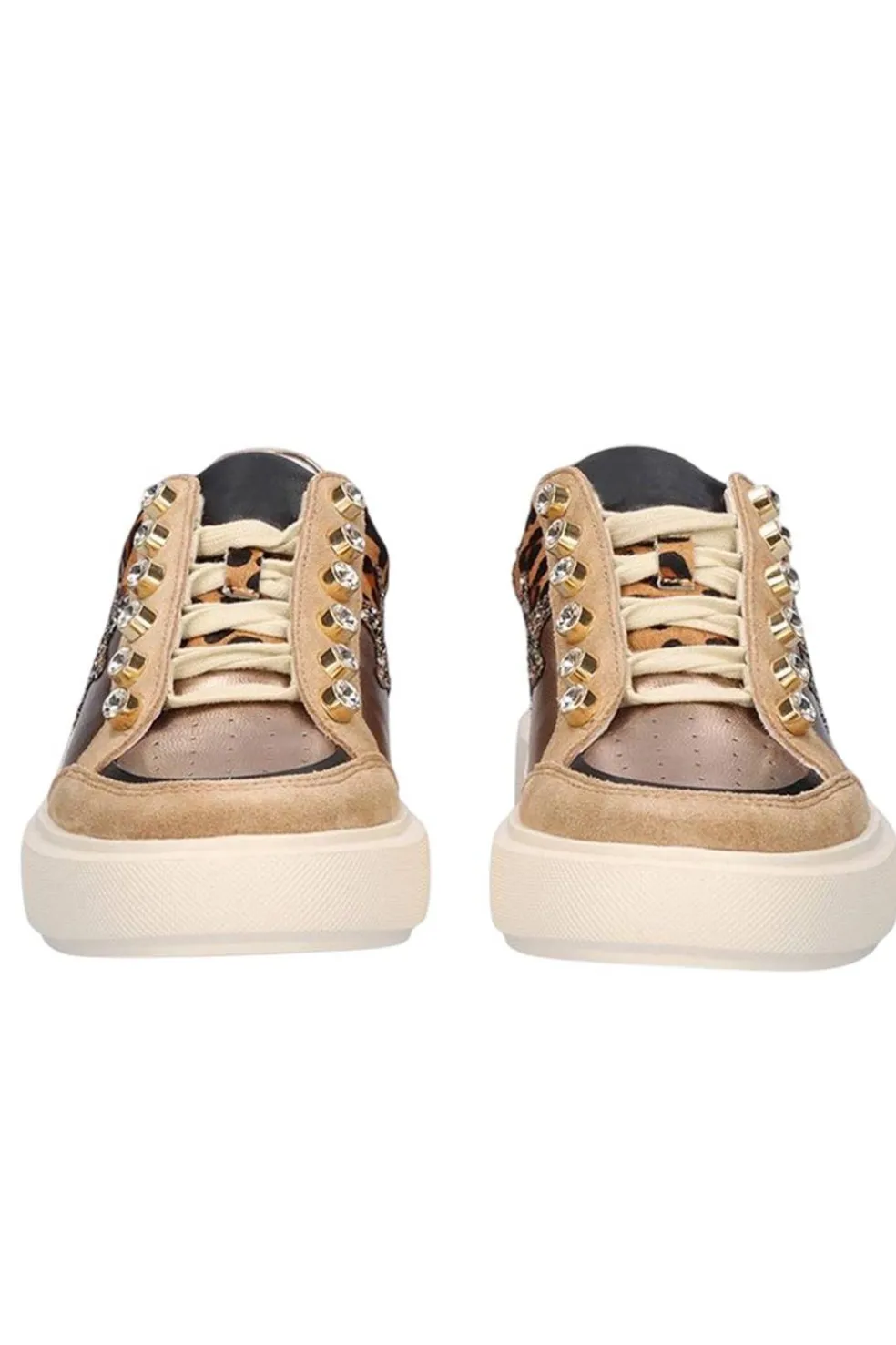 Deportivas Exé en color leopard camel. Este diseño tiene su corte y plantilla de piel de gran calidad junto con una suela de material sintético. Para dar mayor confort, el modelo cuenta con una suela de 3,5 cm de grosor y cierre de cordones.