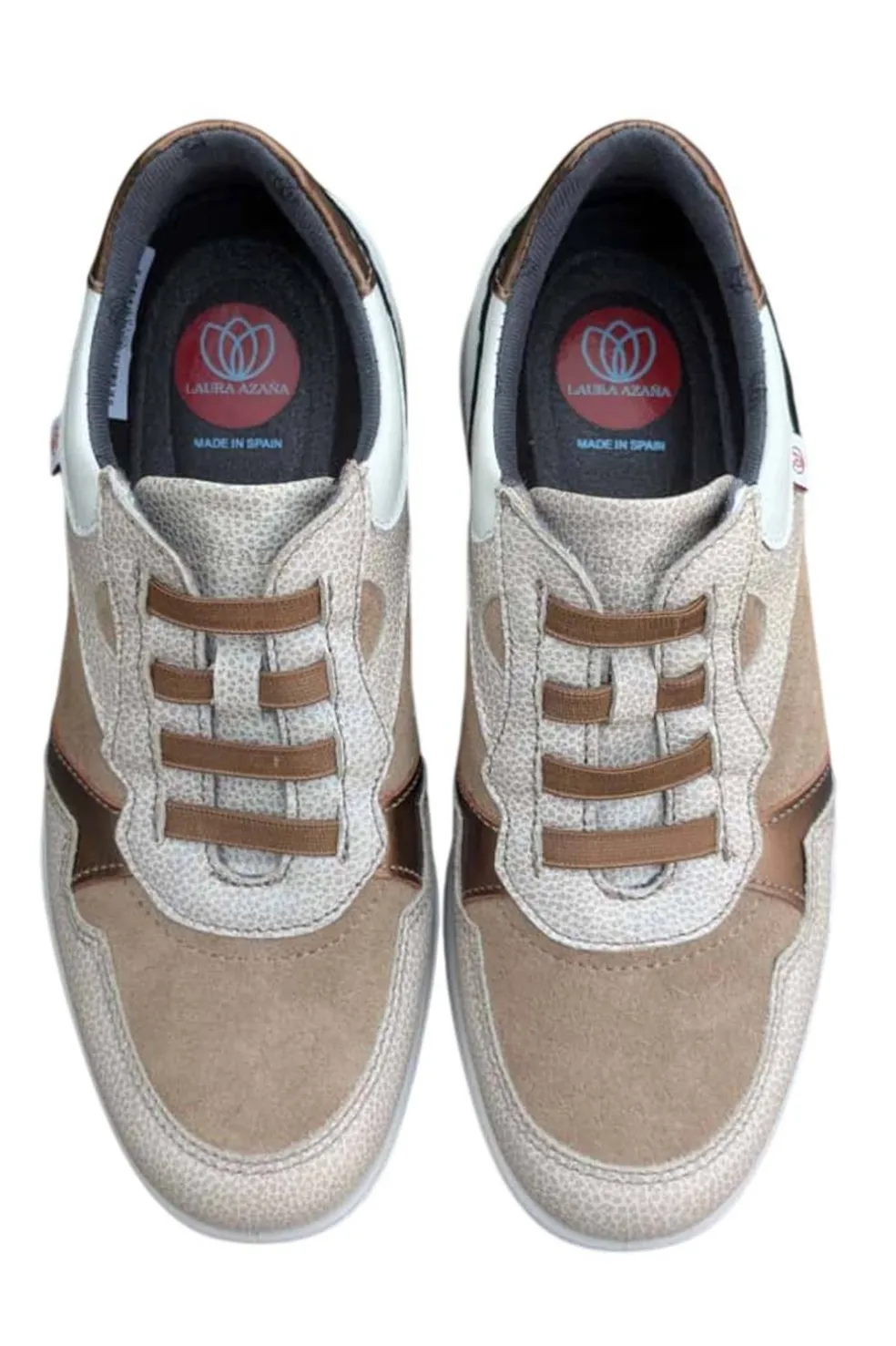 Deportivo de mujer Laura Azaña en color beige, con detalle de estampado en el talón que aporta un toque moderno y distintivo. Su diseño sin cierre incluye gomas en el empeine para un ajuste cómodo y práctico. Con suela de 4 cm, ofrece una pisada ligera y estable, ideal para el uso diario. Un modelo muy cómodo y versátil, perfecto para combinar con cualquier look. Fabricado en España con materiales de calidad.
