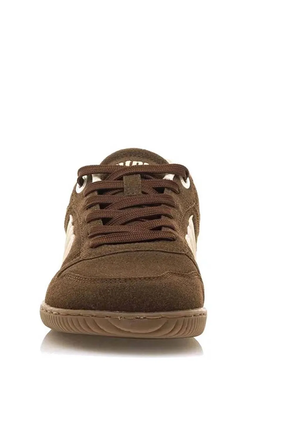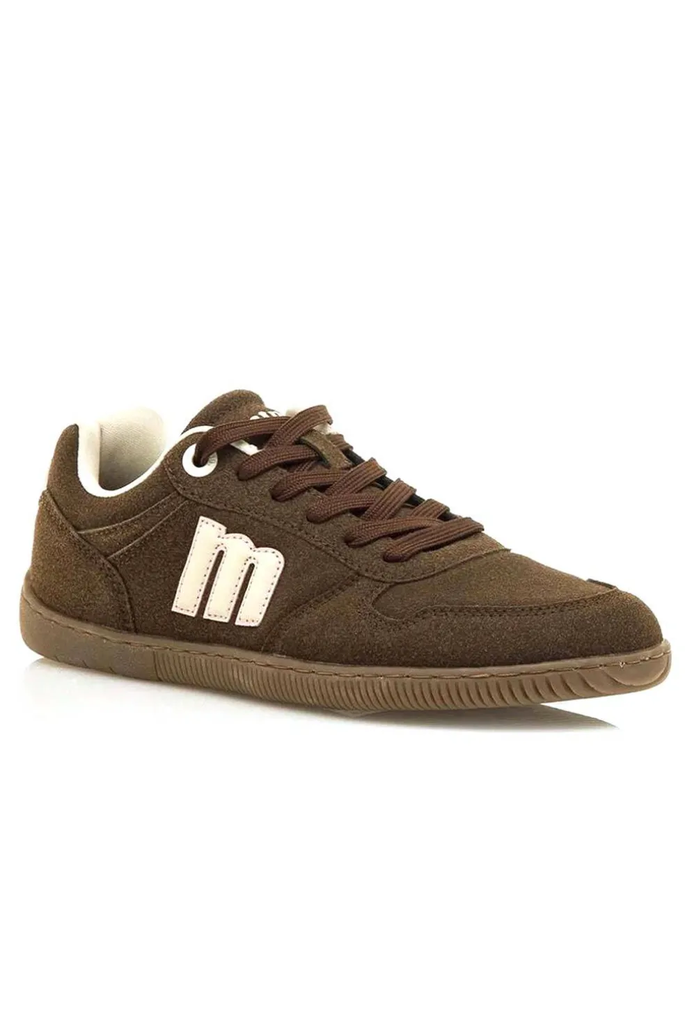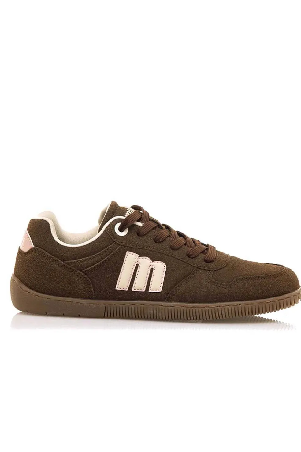 Zapatillas casual de color moka para mujer de la marca Mustang, modelo Free Aria. Su diseño de paneles con acabado tipo ante incorpora el logo “m” en ambos lados en tono crudo, y detalles en rosa claro en el talón que aportan un contraste suave.
